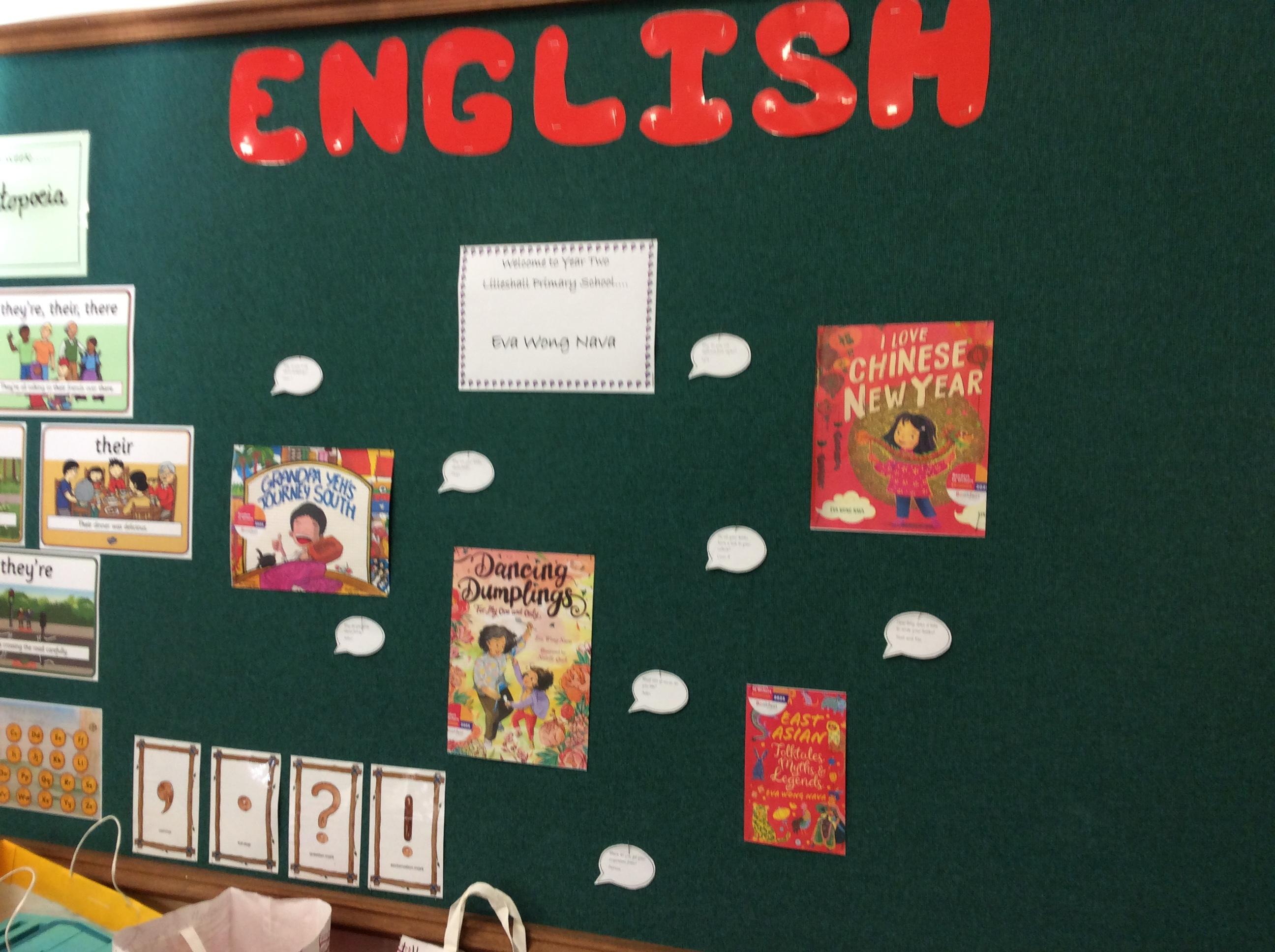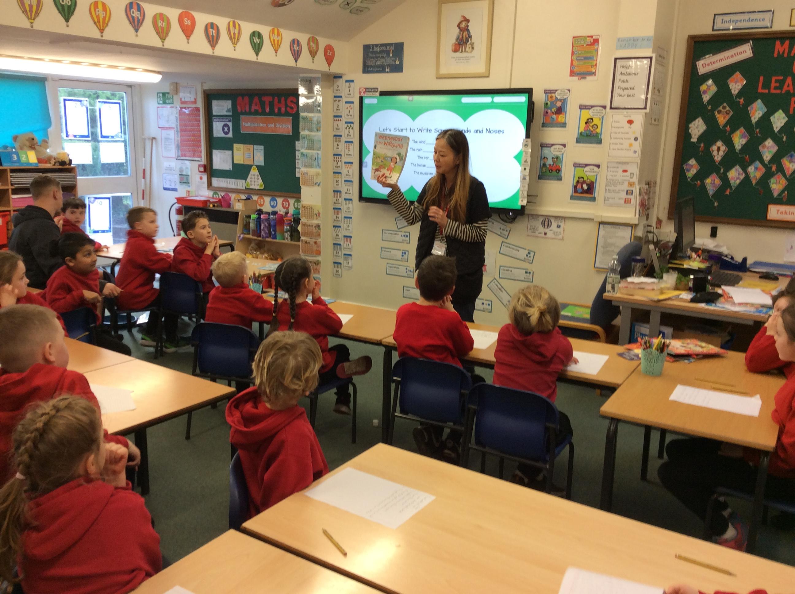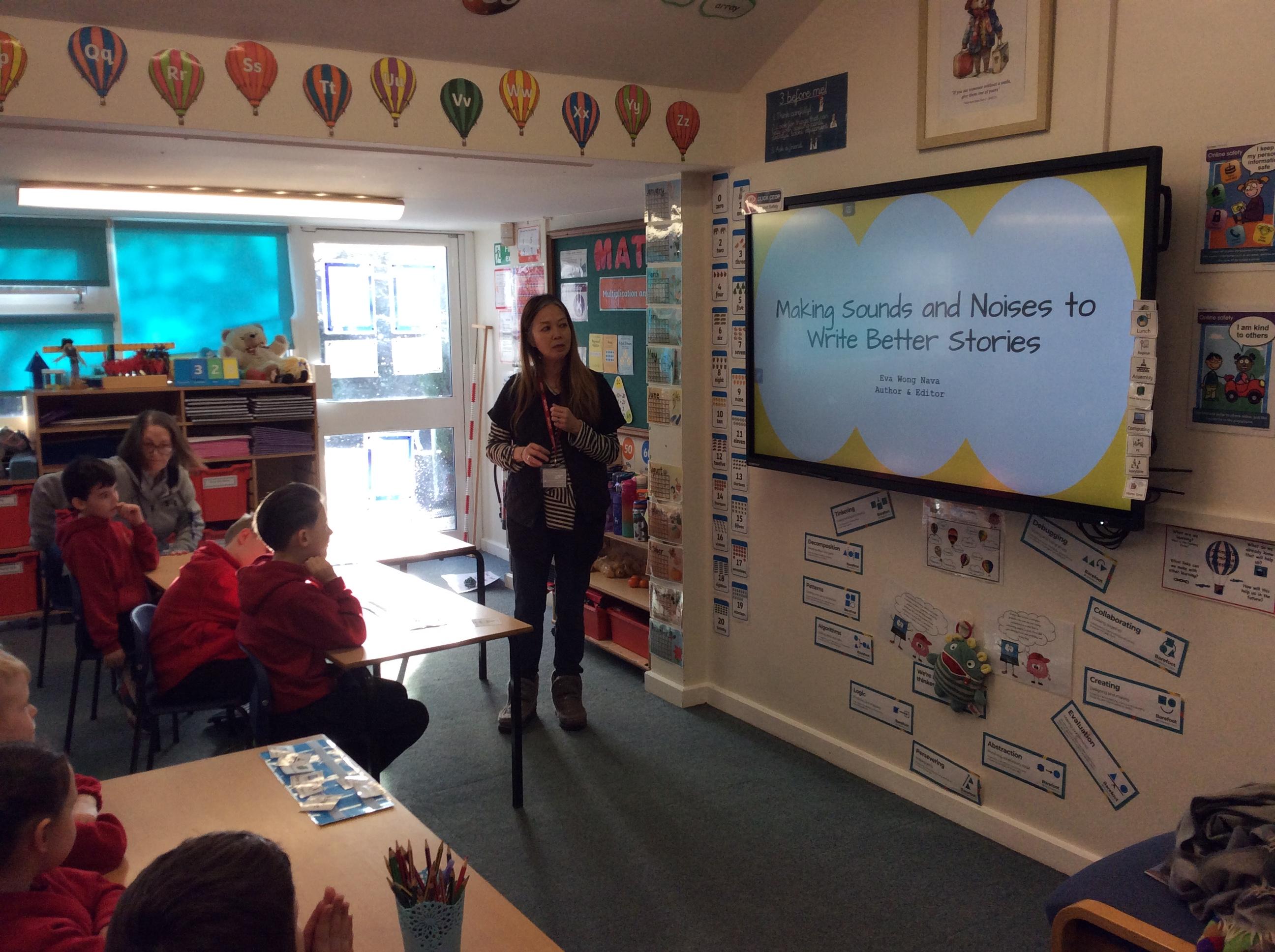 We had a very exciting morning today in Year Two where we welcomed the author Eva Wong Nava into our classroom. Eva spoke to us about her work as an author and what inspires her story writing. She read her story ' Dancing Dumplings For My One and Only' aloud to the class and then we took part in a writing workshop. We looked at the words onomatopoeia and alliteration and what they mean and how we can use them in our writing. We then practised writing sentences using onomatopoeia. We can't wait to use what we learned with Eva today to help us write our own stories for the Readers to Writers competition.