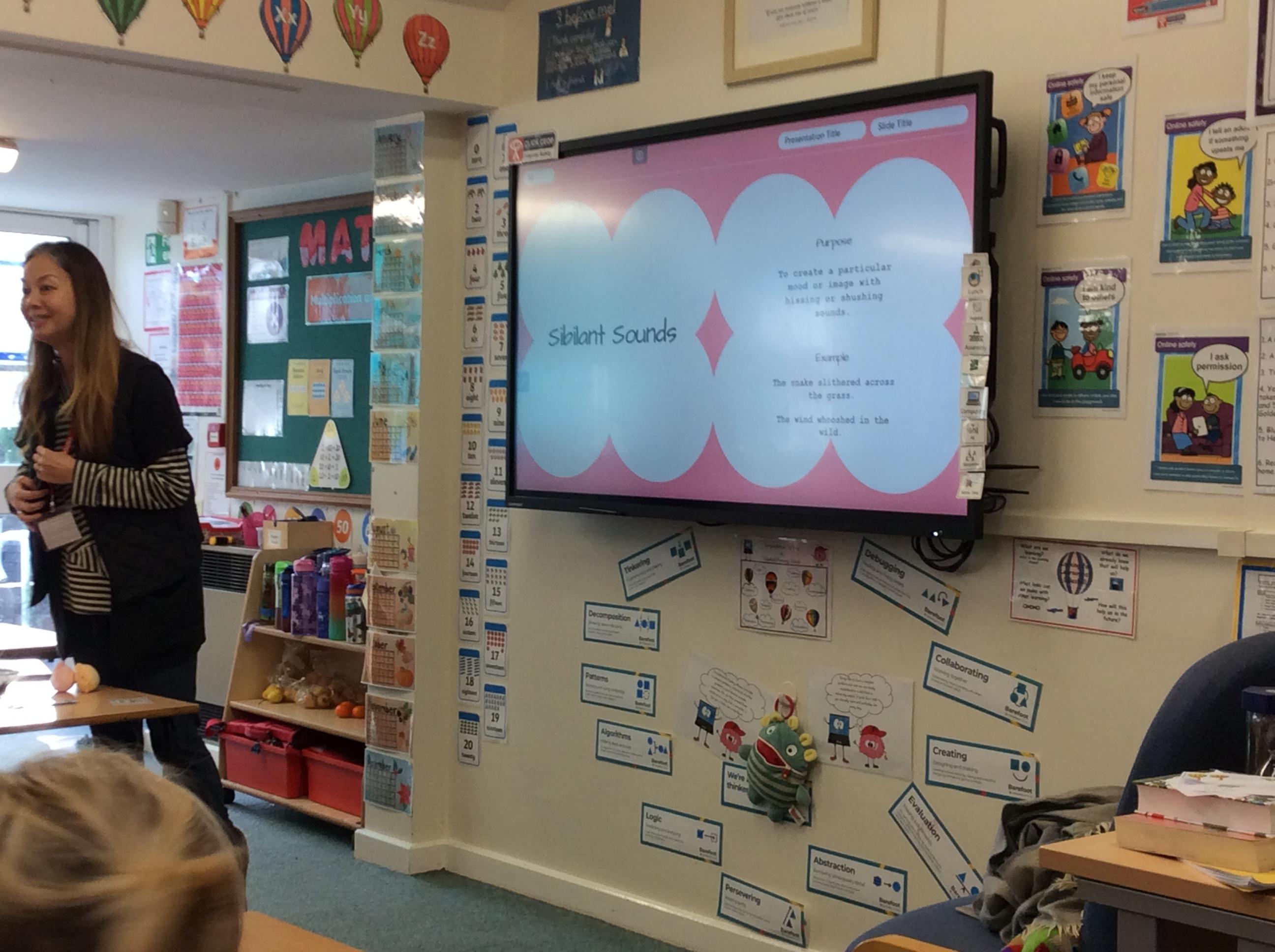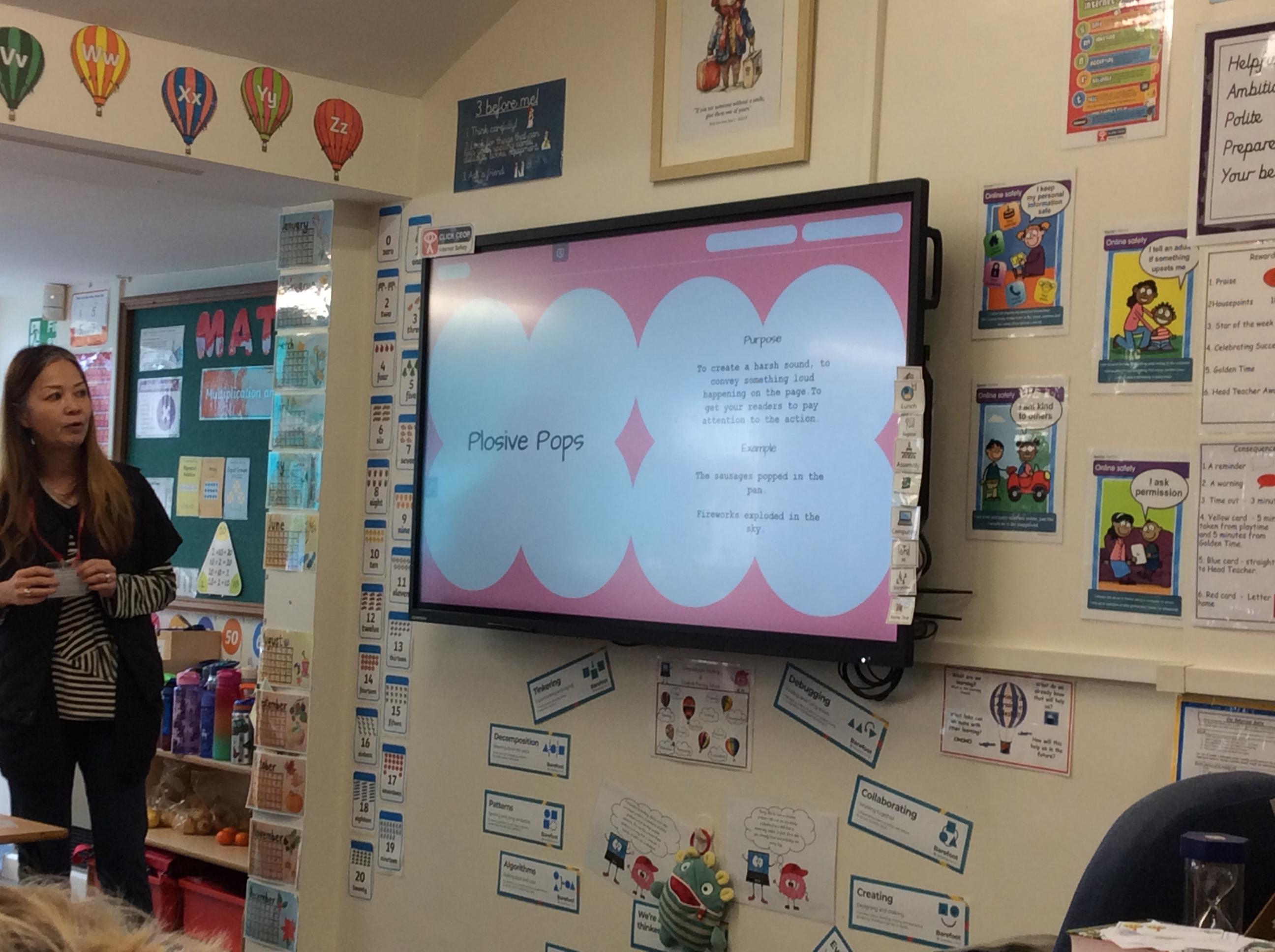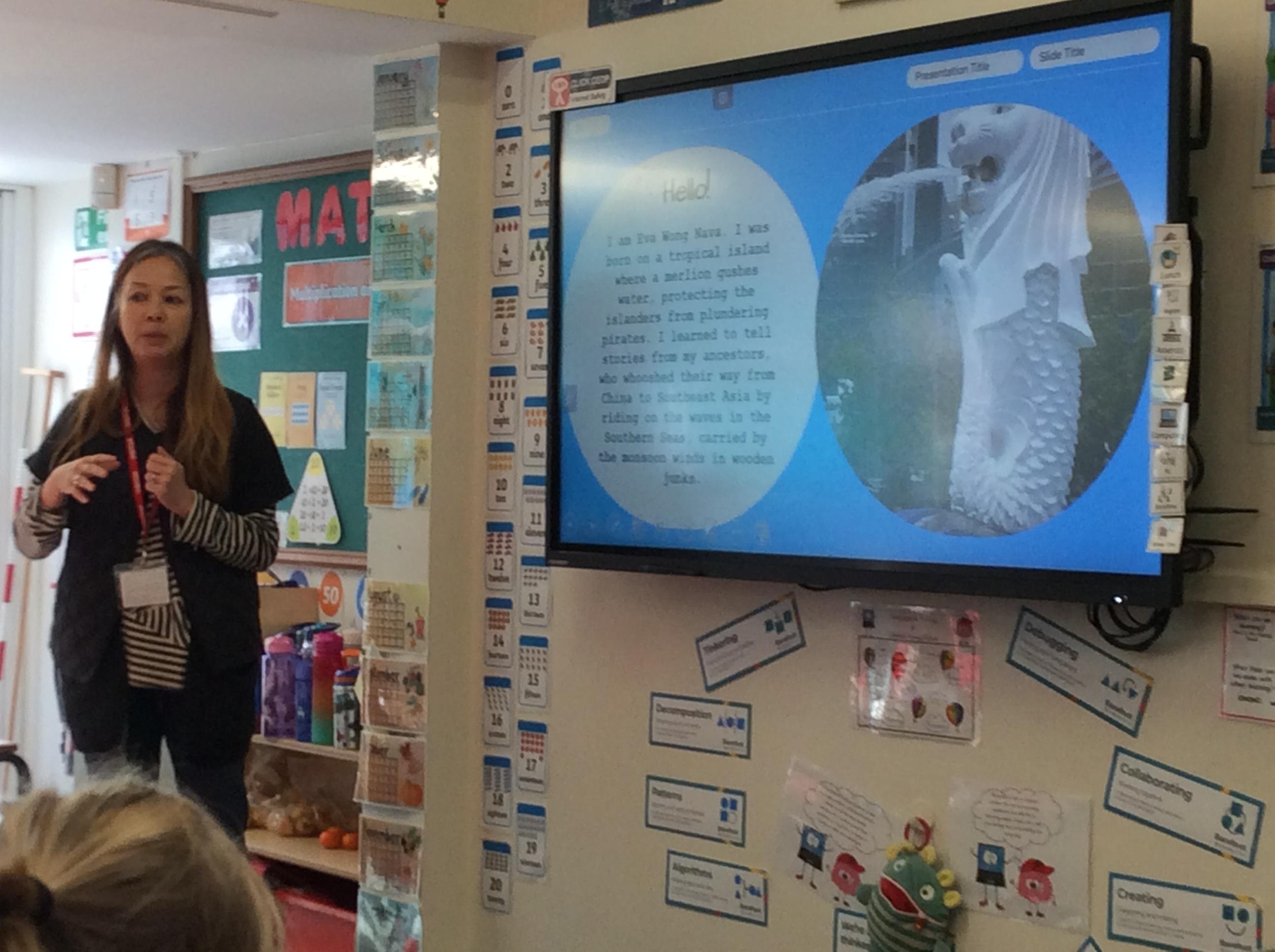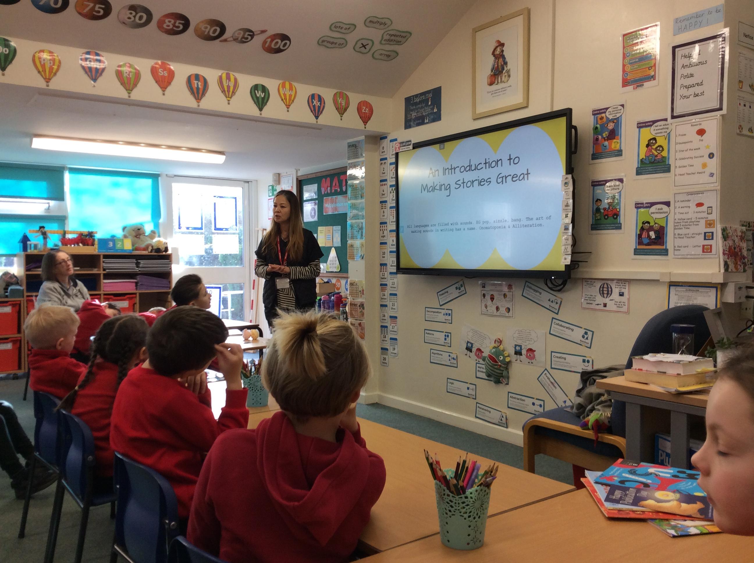 We had a very exciting morning today in Year Two where we welcomed the author Eva Wong Nava into our classroom. Eva spoke to us about her work as an author and what inspires her story writing. She read her story ' Dancing Dumplings For My One and Only' aloud to the class and then we took part in a writing workshop. We looked at the words onomatopoeia and alliteration and what they mean and how we can use them in our writing. We then practised writing sentences using onomatopoeia. We can't wait to use what we learned with Eva today to help us write our own stories for the Readers to Writers competition.