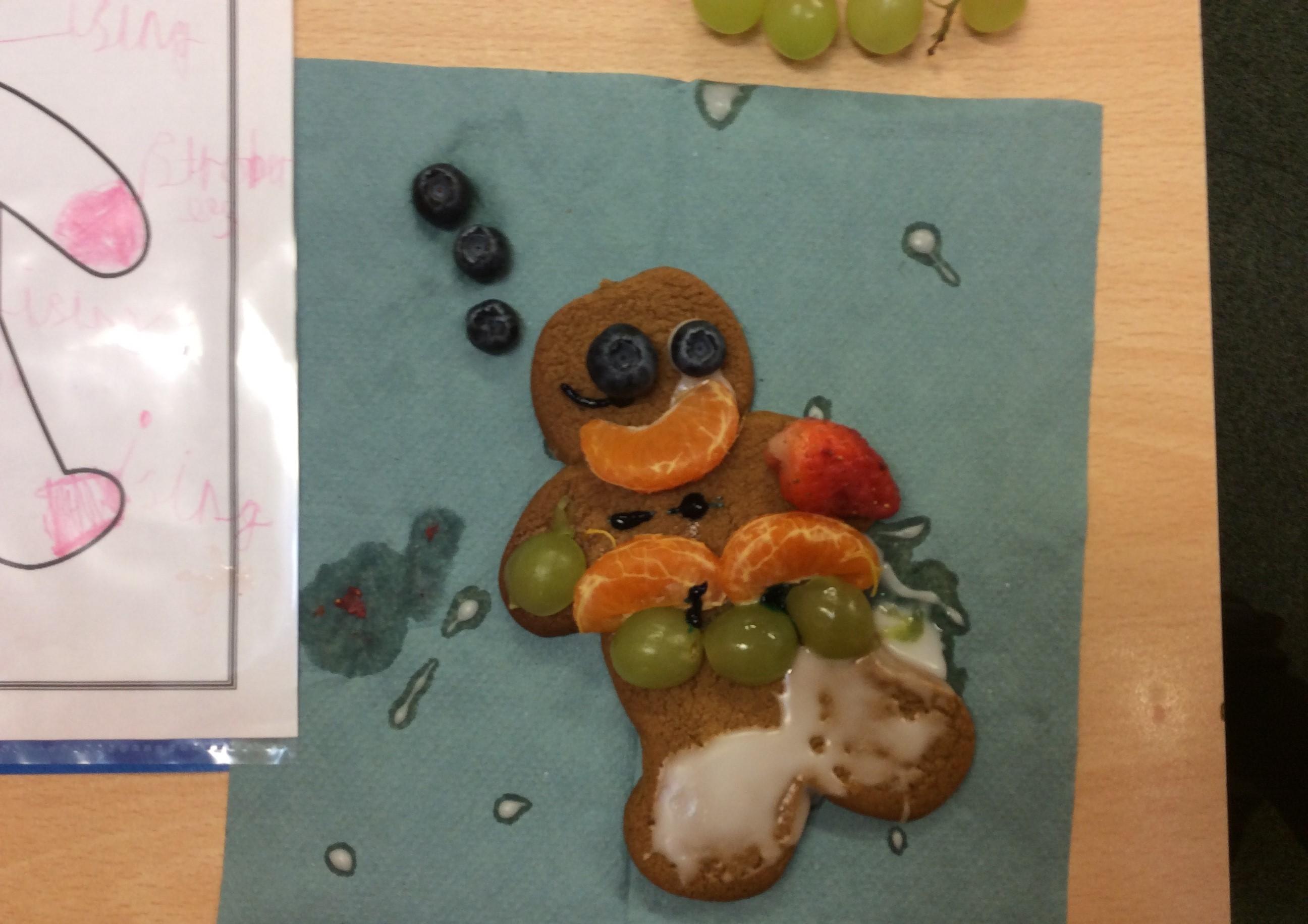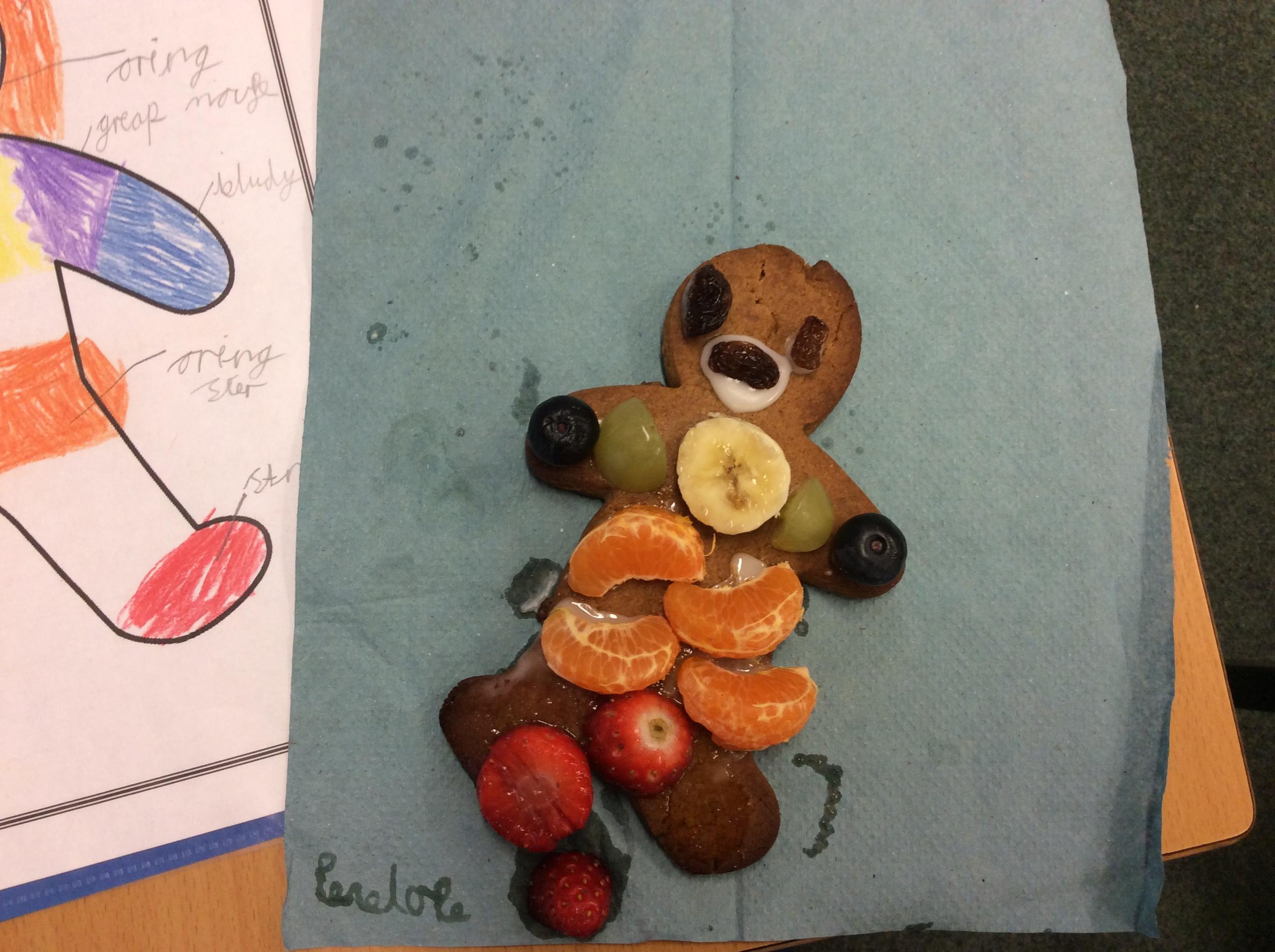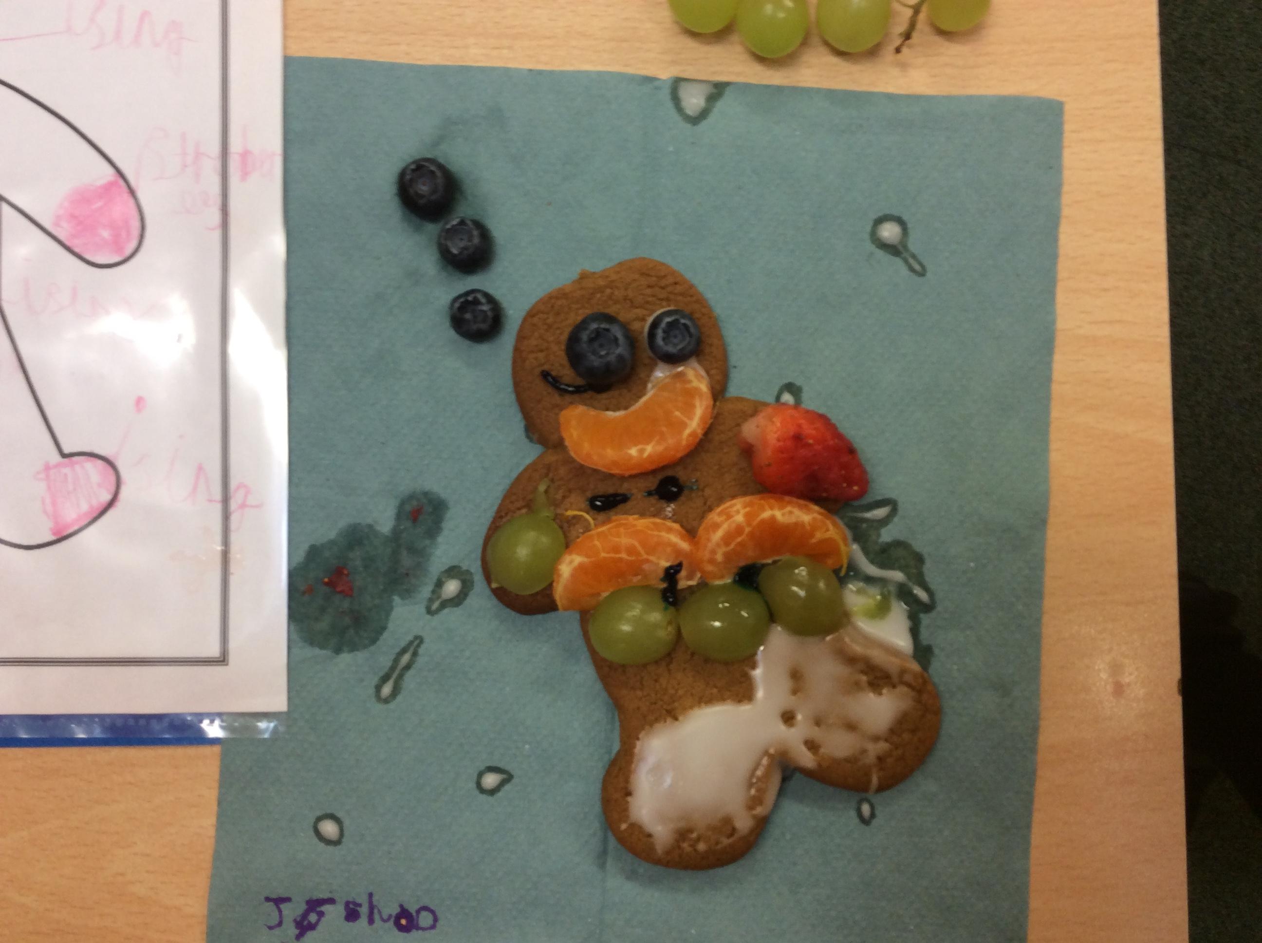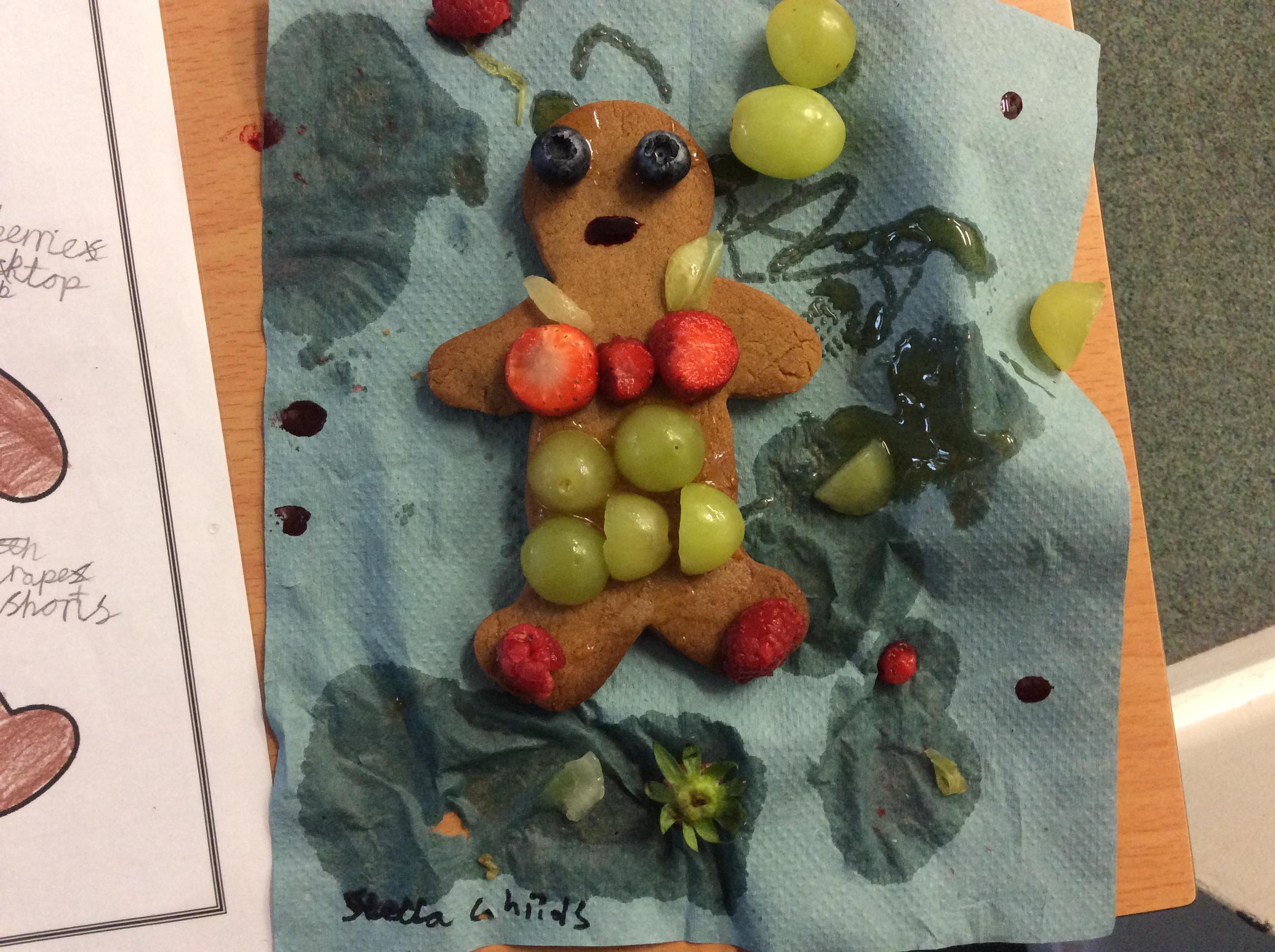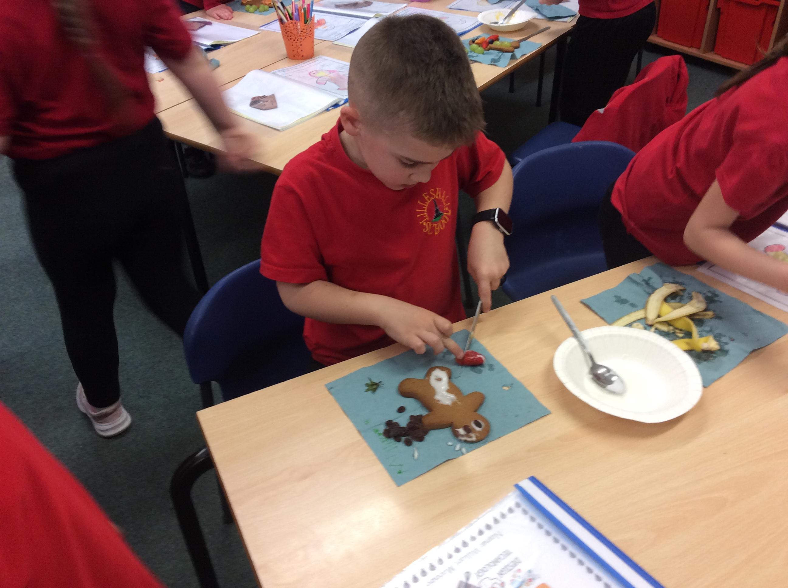 In our lesson today we made Gingerbread Men and then decorated them with healthy ingredients. We followed our designs carefully, making any adjustments needed as necessary. At the end of our lesson Mrs Cousins and Mr Firmstone-Hill came in to judge our Gingerbread Men and select two they would choose to buy based on their appearance, how healthy they were and how close to they were to the design.