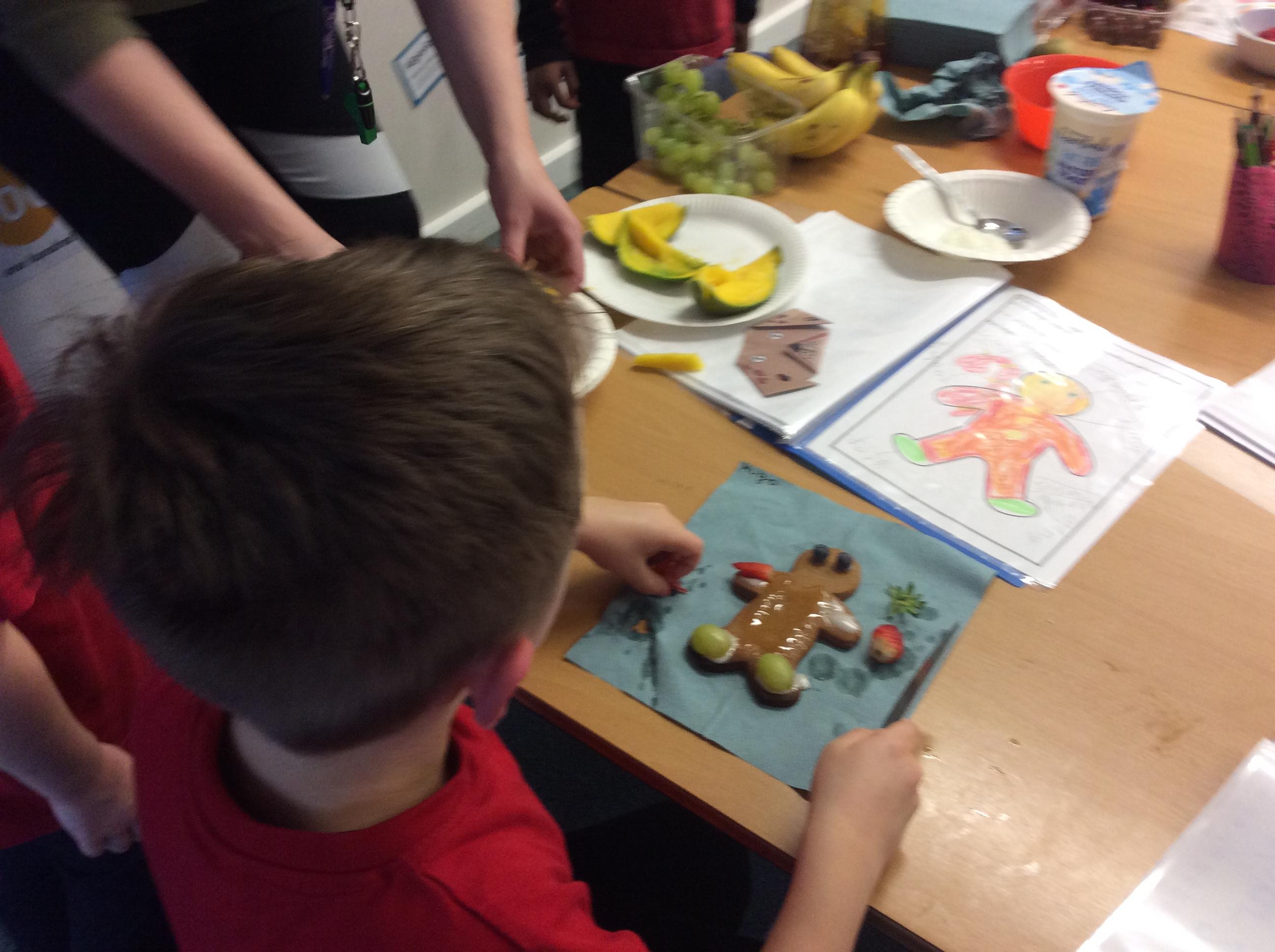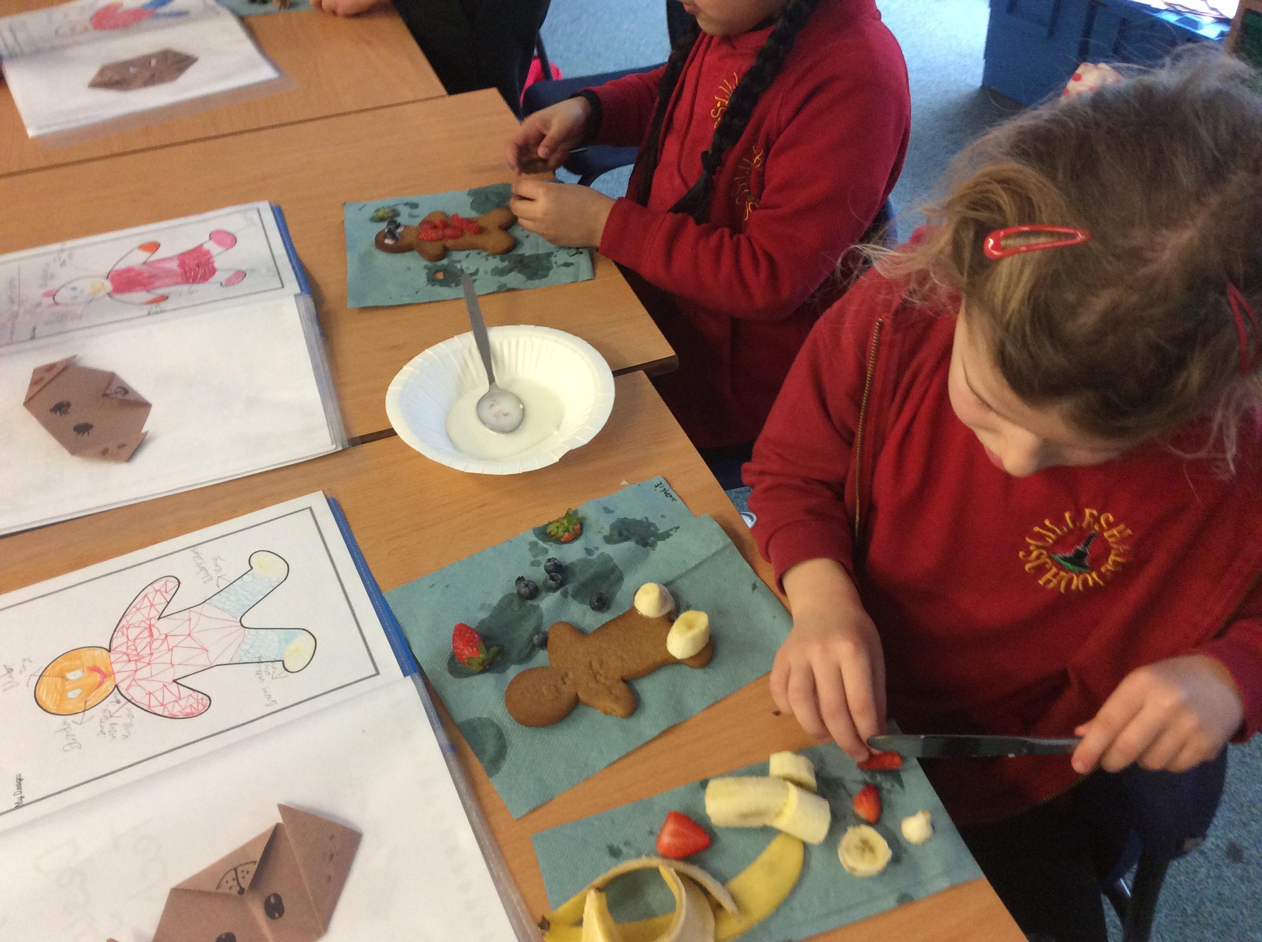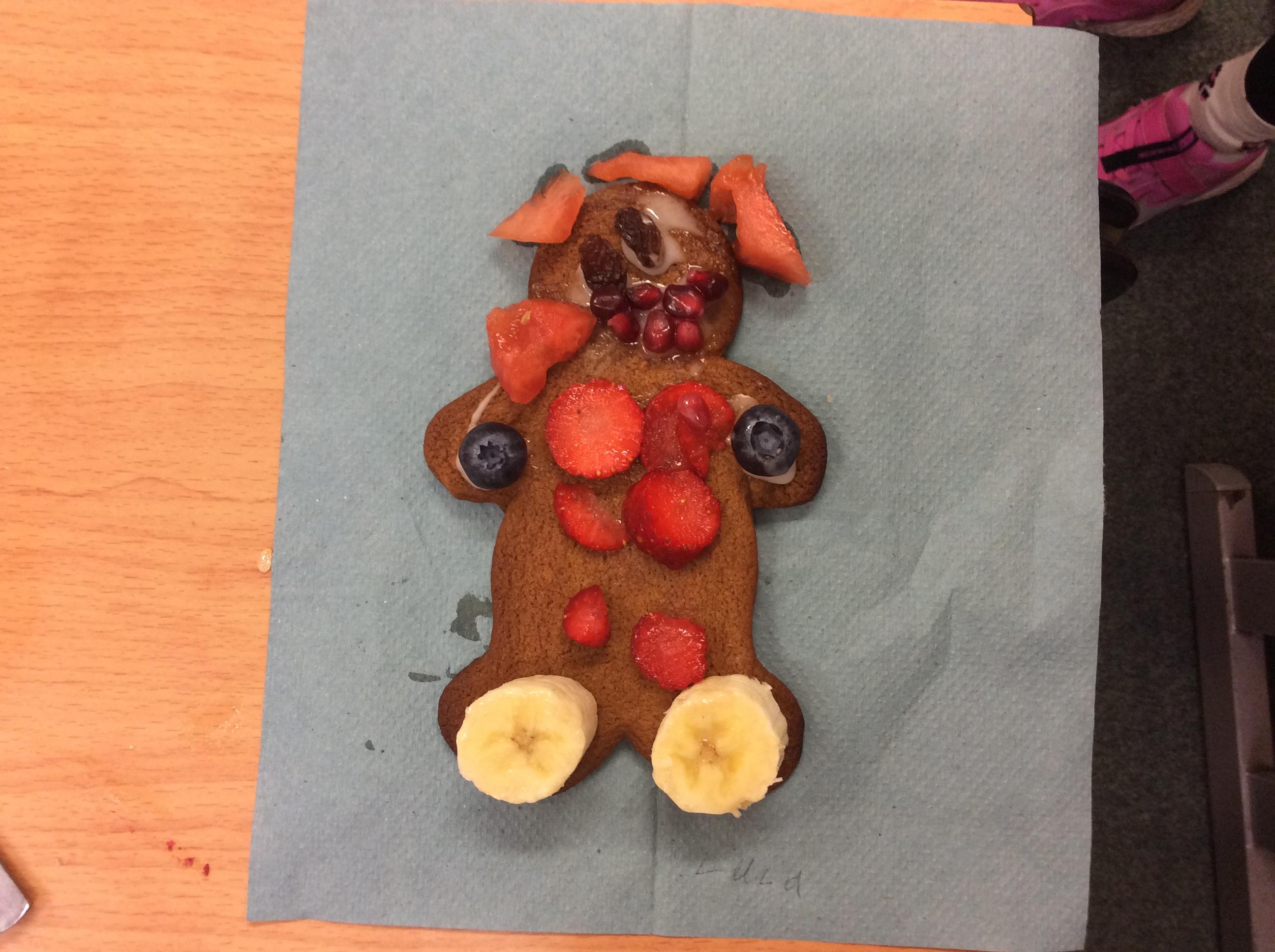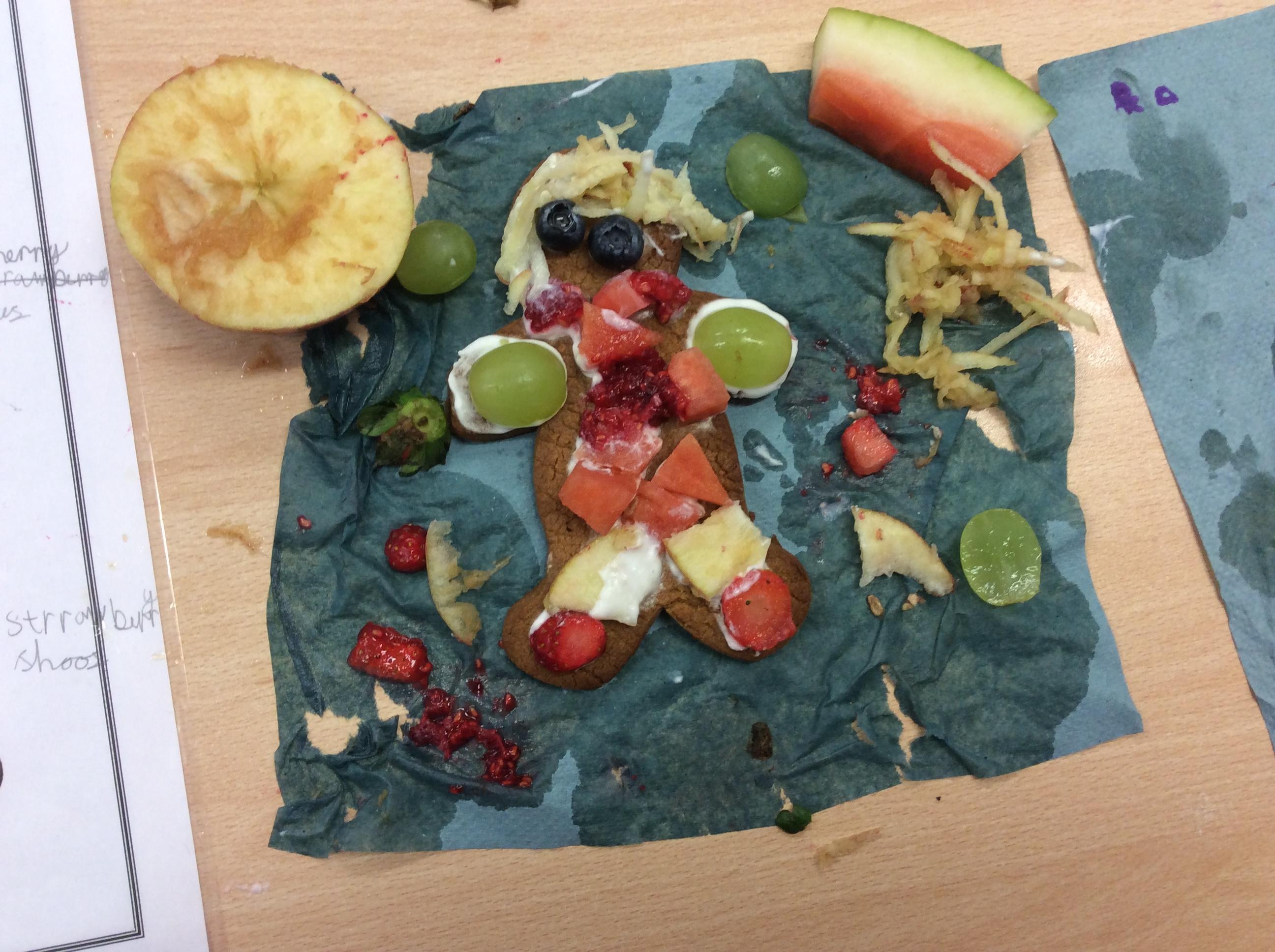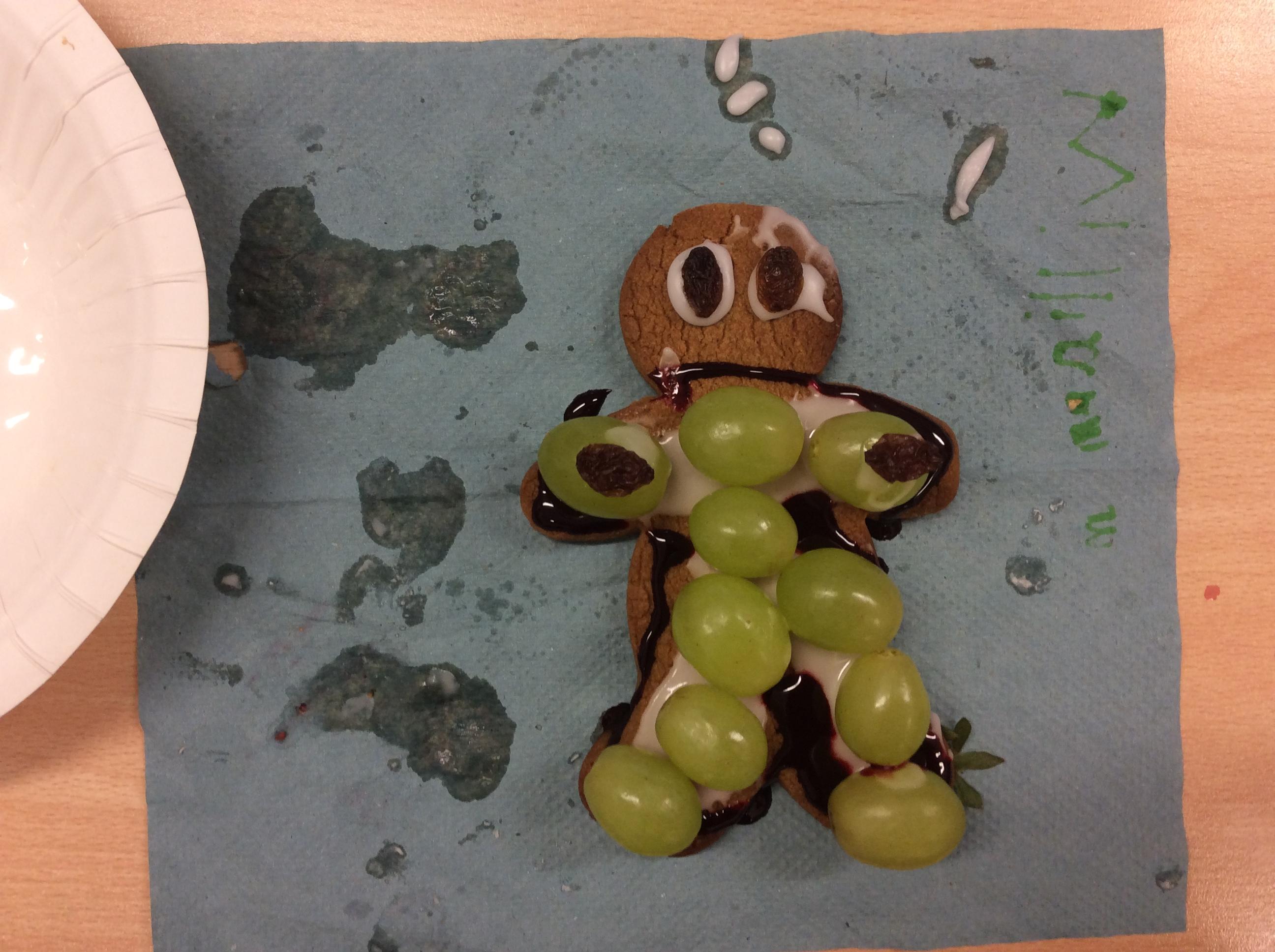 In our lesson today we made Gingerbread Men and then decorated them with healthy ingredients. We followed our designs carefully, making any adjustments needed as necessary. At the end of our lesson Mrs Cousins and Mr Firmstone-Hill came in to judge our Gingerbread Men and select two they would choose to buy based on their appearance, how healthy they were and how close to they were to the design.