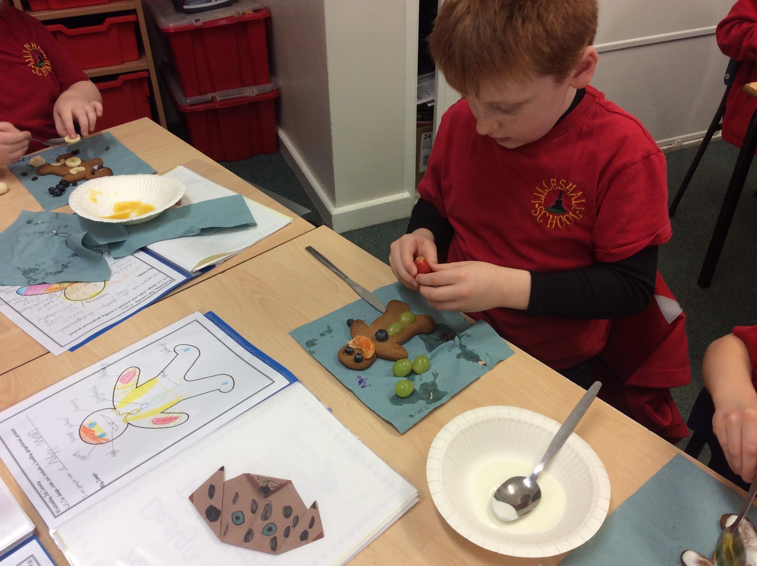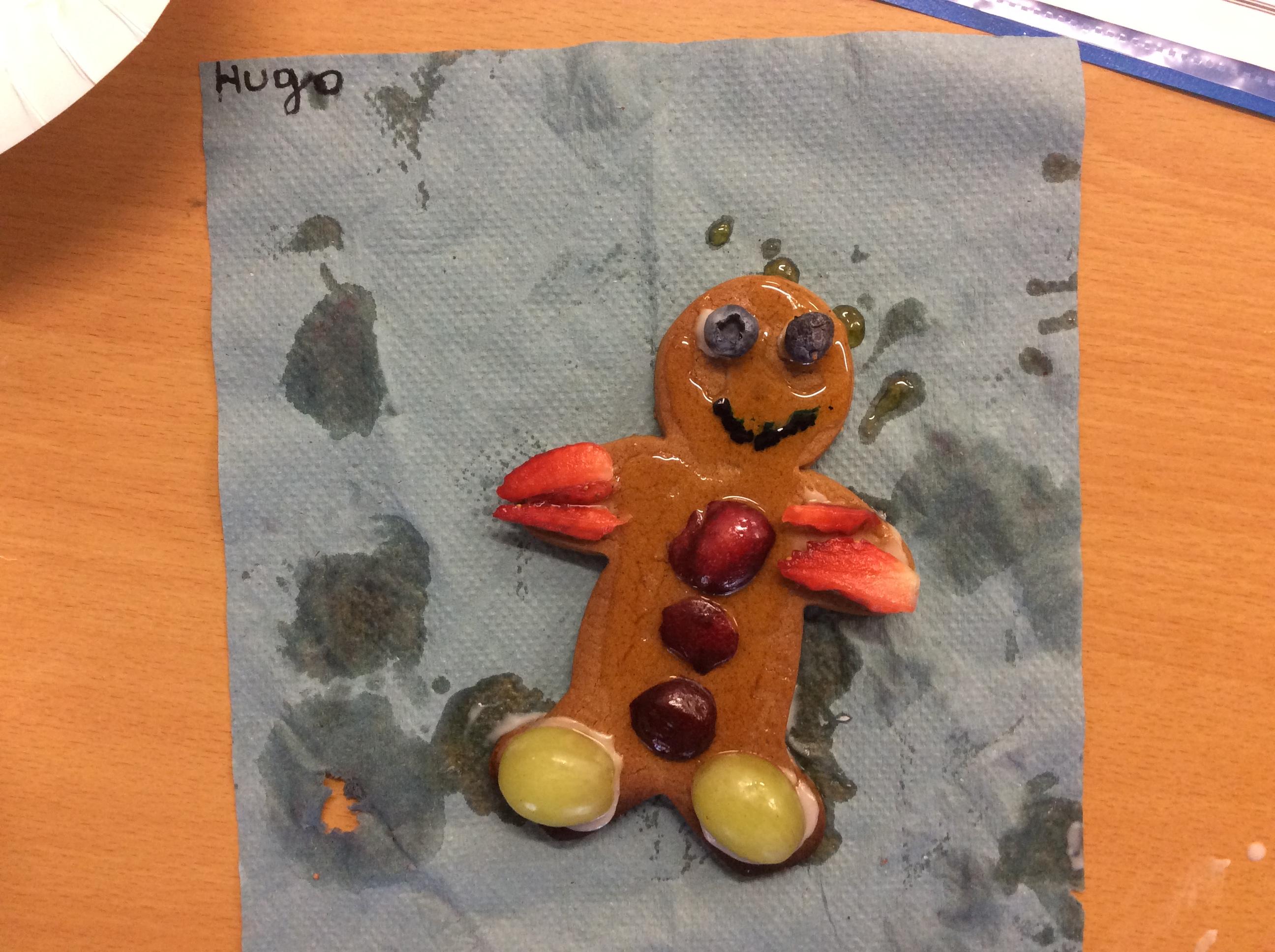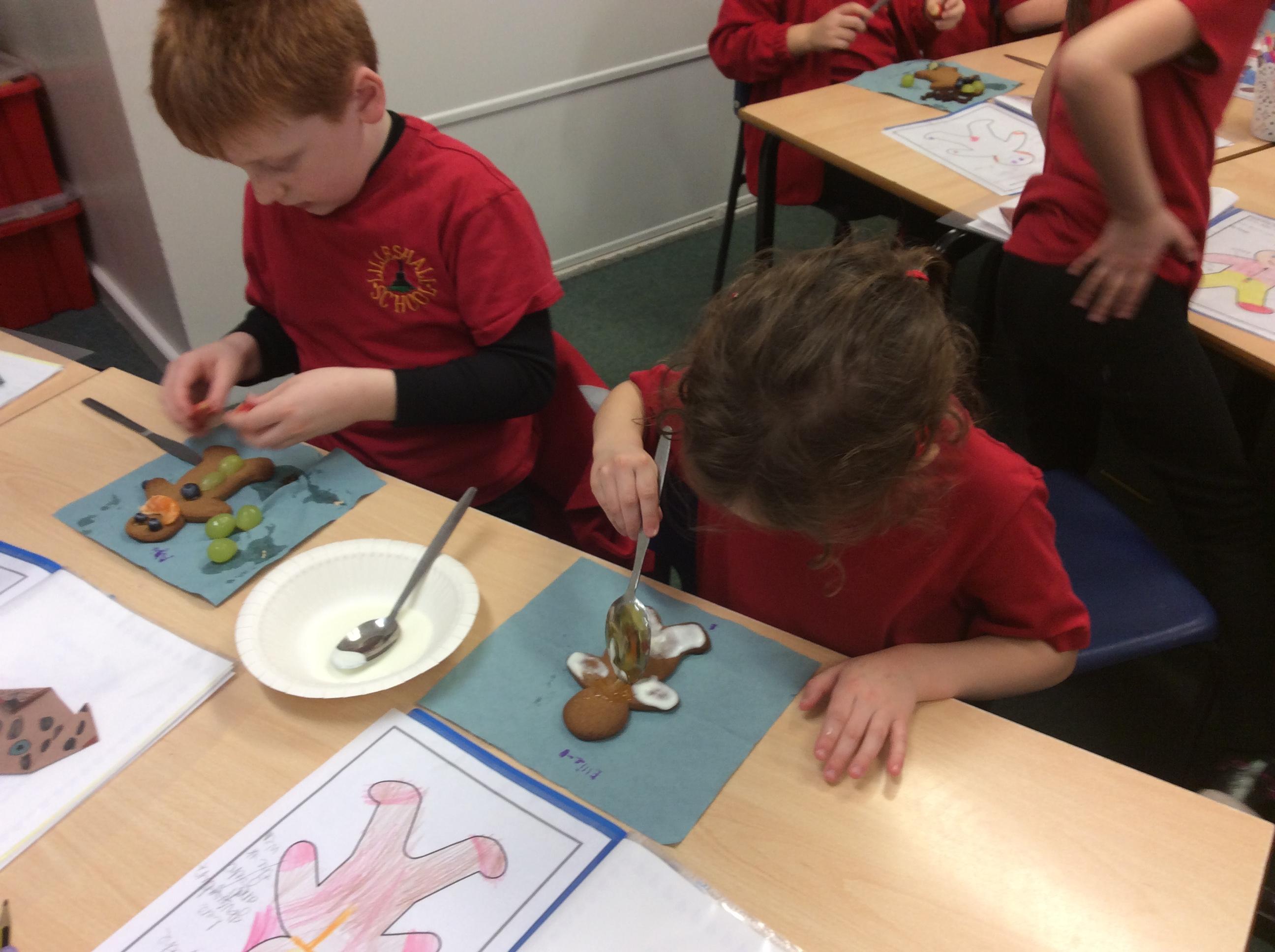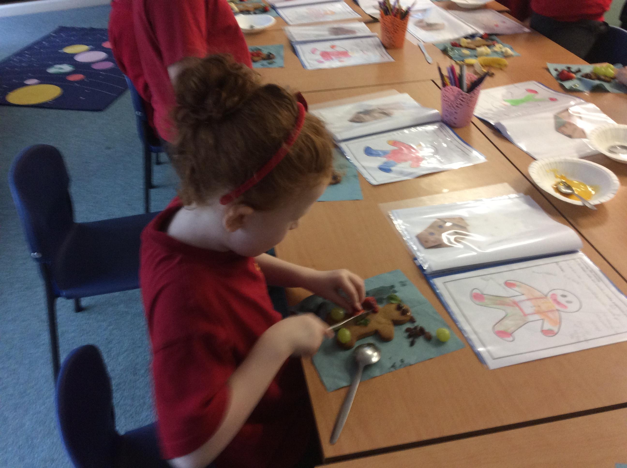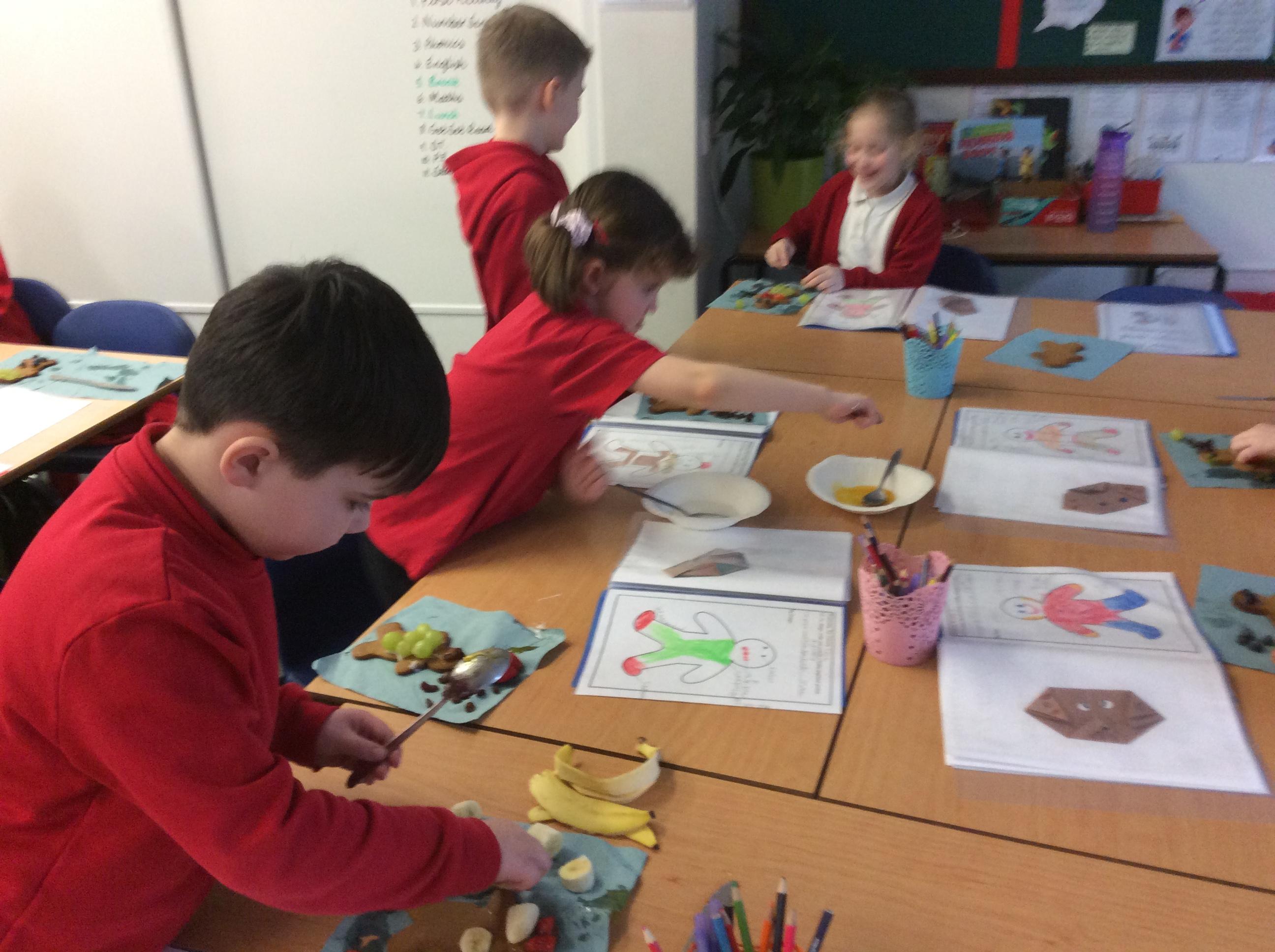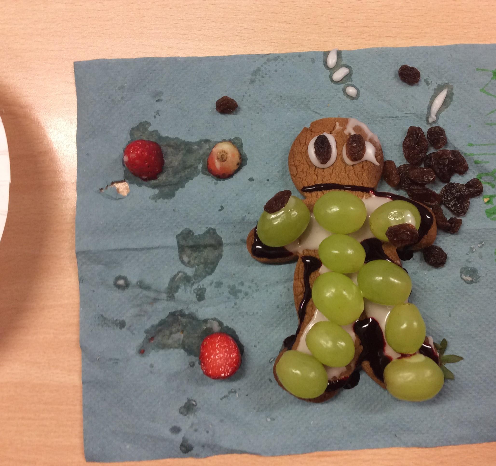In our lesson today we made Gingerbread Men and then decorated them with healthy ingredients. We followed our designs carefully, making any adjustments needed as necessary. At the end of our lesson Mrs Cousins and Mr Firmstone-Hill came in to judge our Gingerbread Men and select two they would choose to buy based on their appearance, how healthy they were and how close to they were to the design.