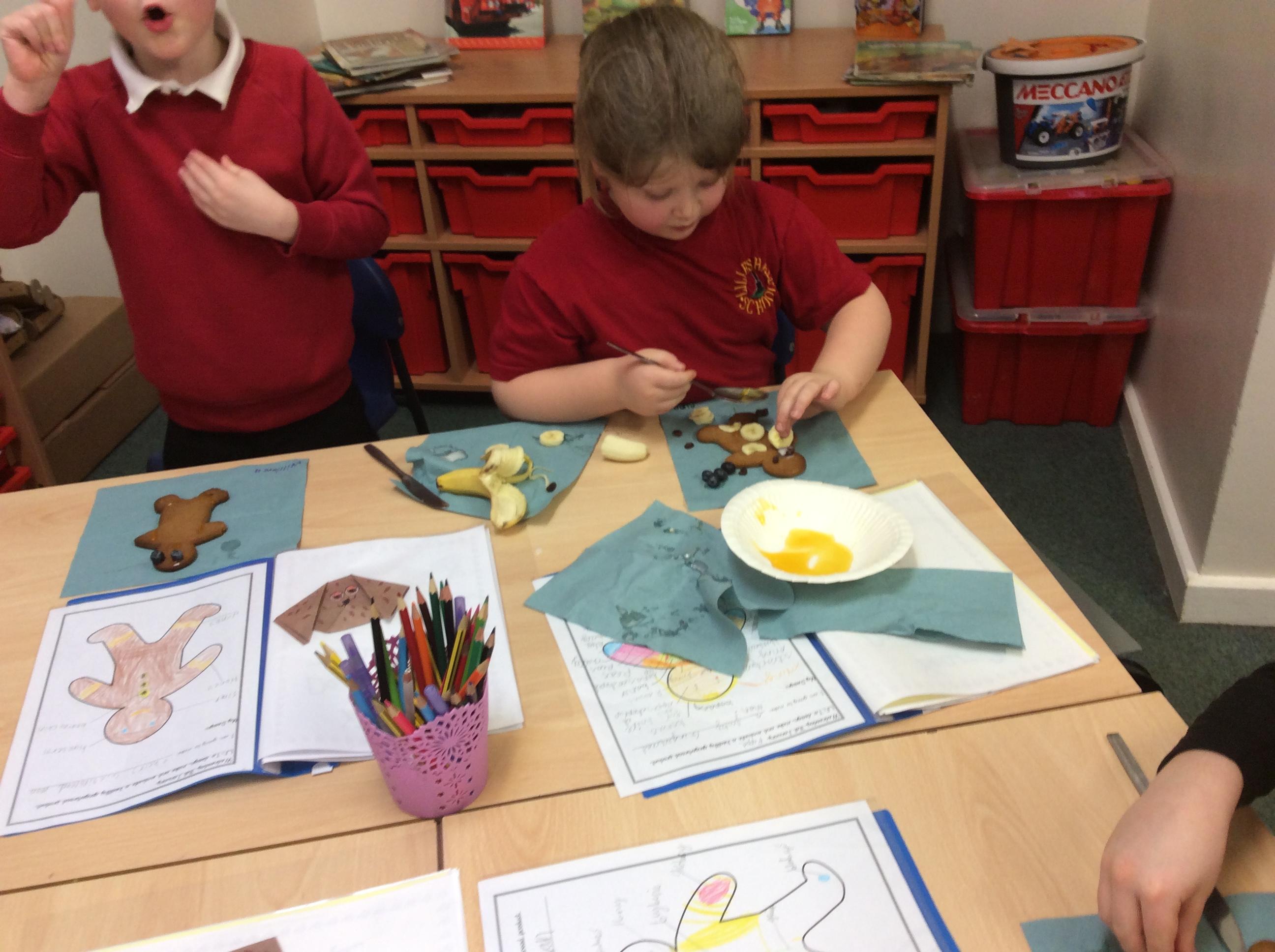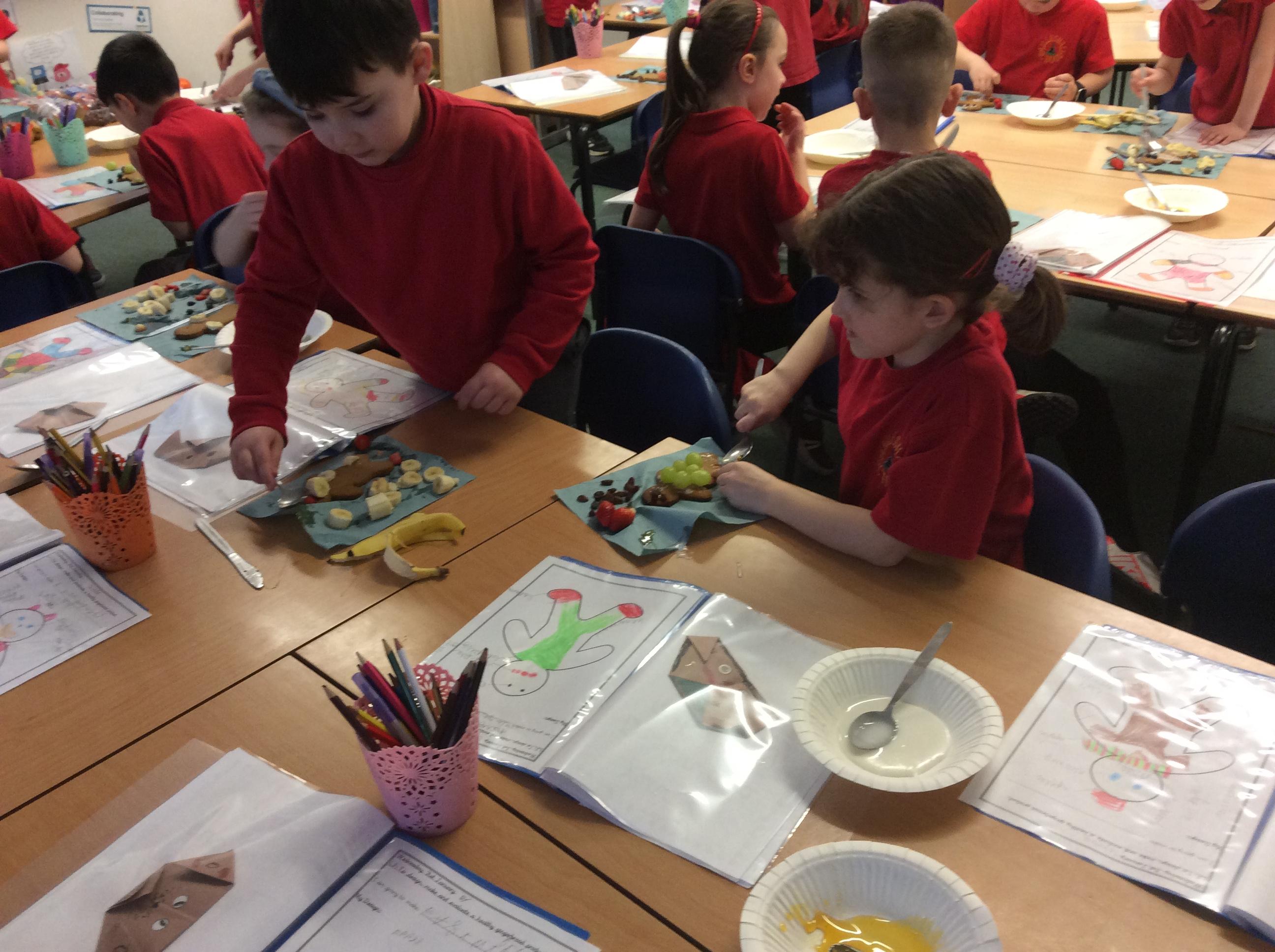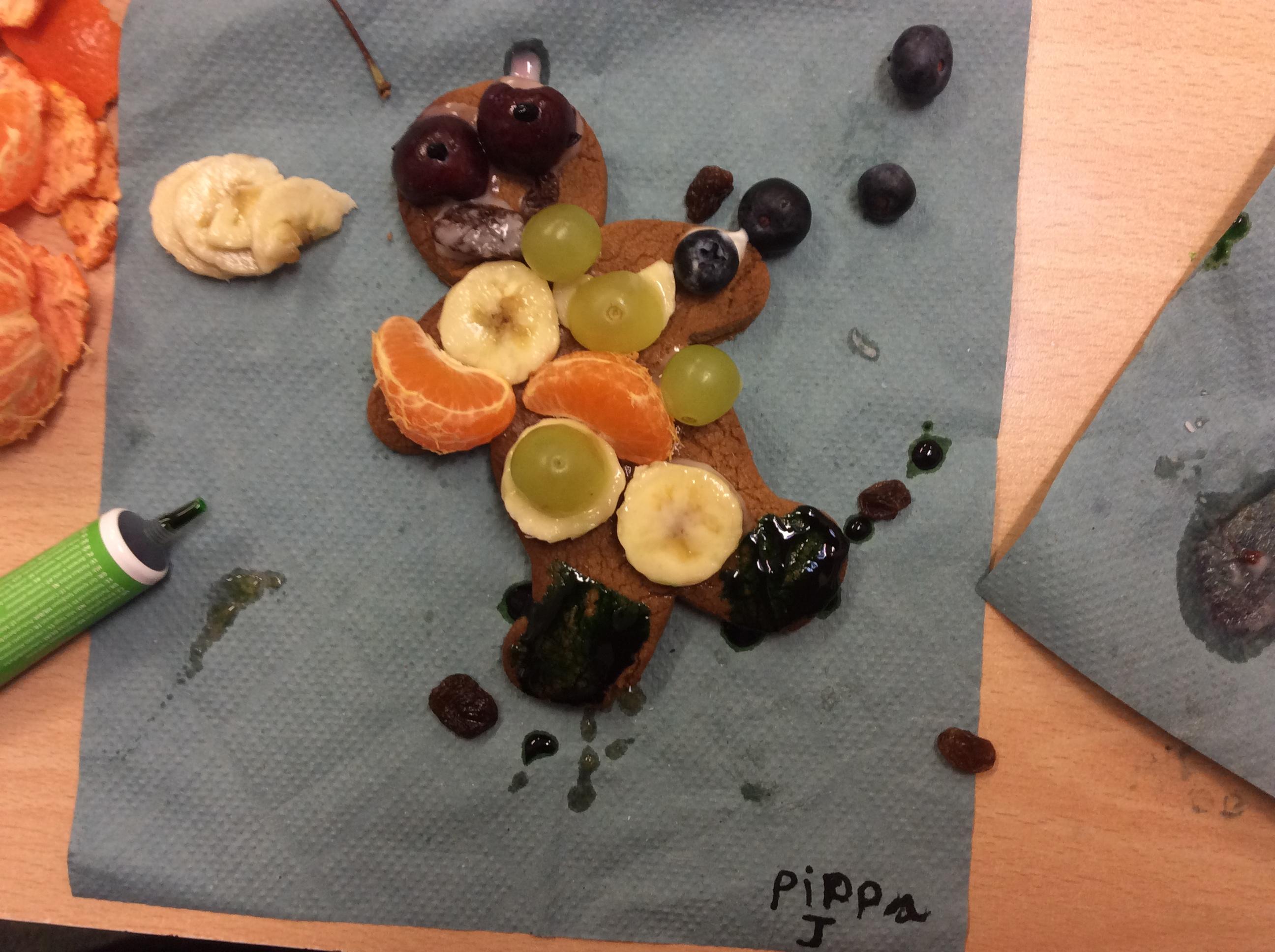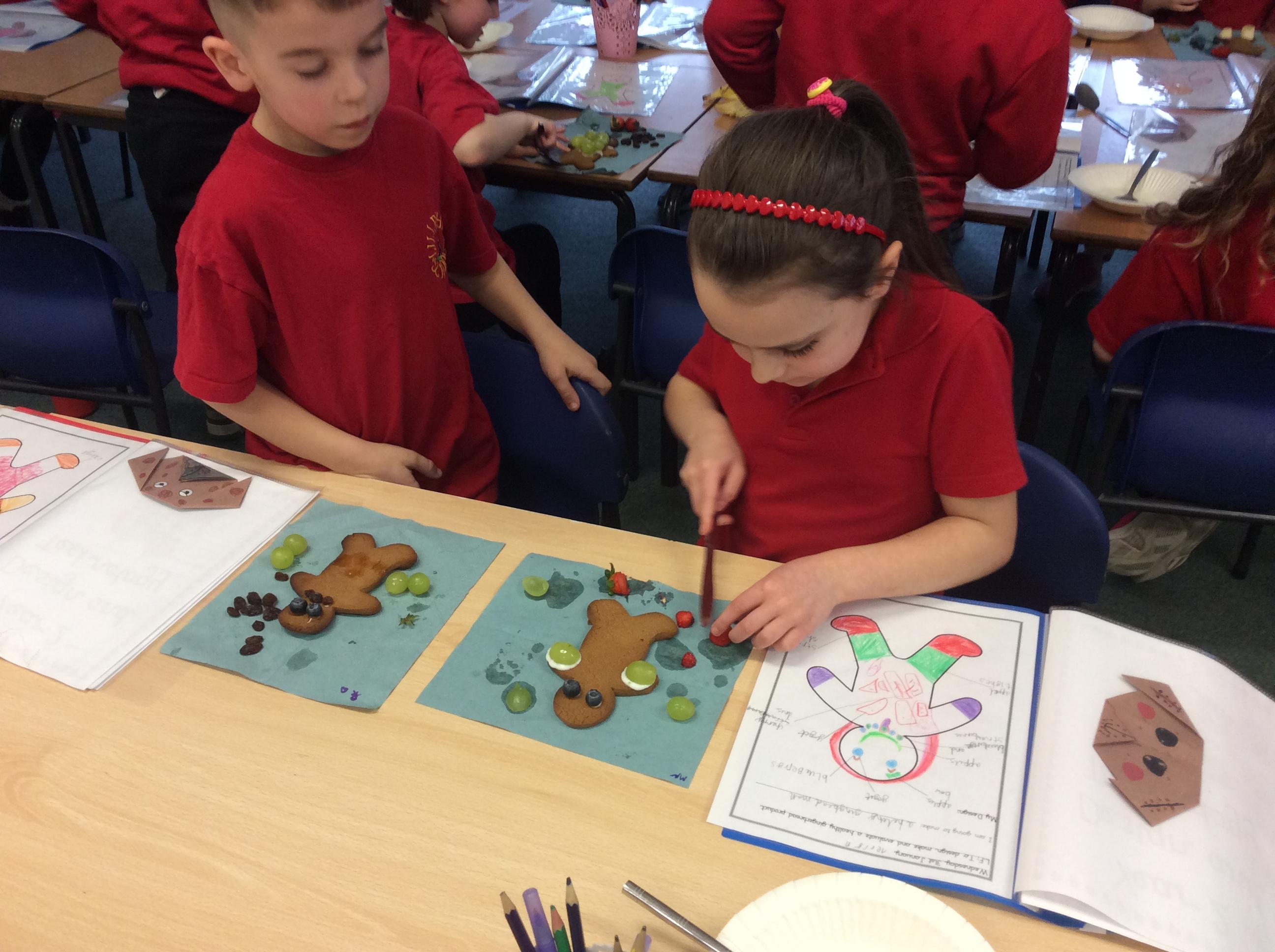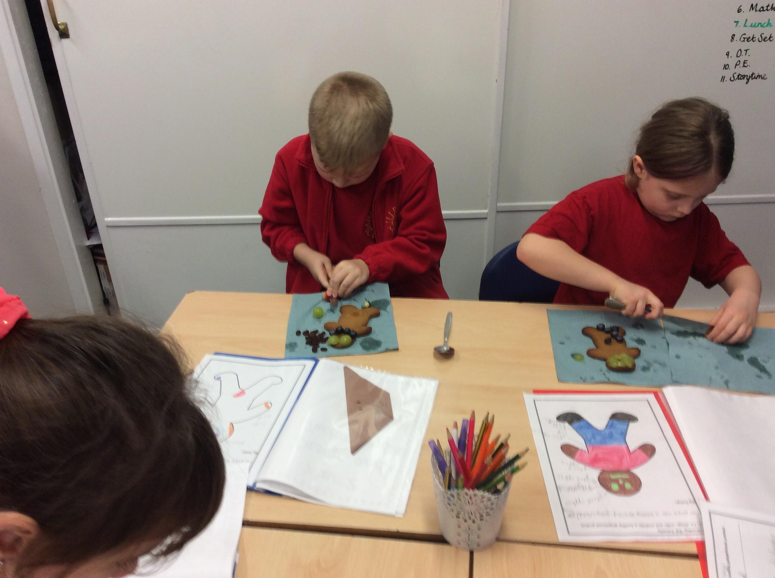 In our lesson today we made Gingerbread Men and then decorated them with healthy ingredients. We followed our designs carefully, making any adjustments needed as necessary. At the end of our lesson Mrs Cousins and Mr Firmstone-Hill came in to judge our Gingerbread Men and select two they would choose to buy based on their appearance, how healthy they were and how close to they were to the design.