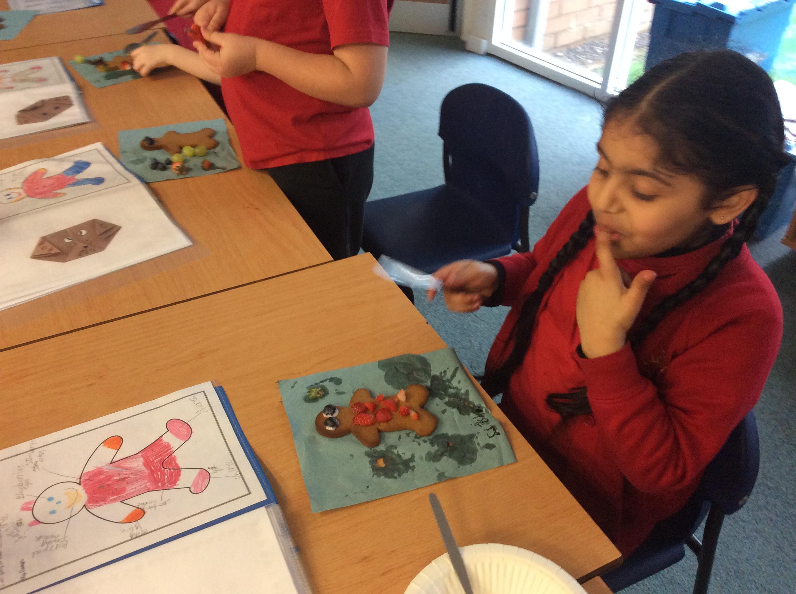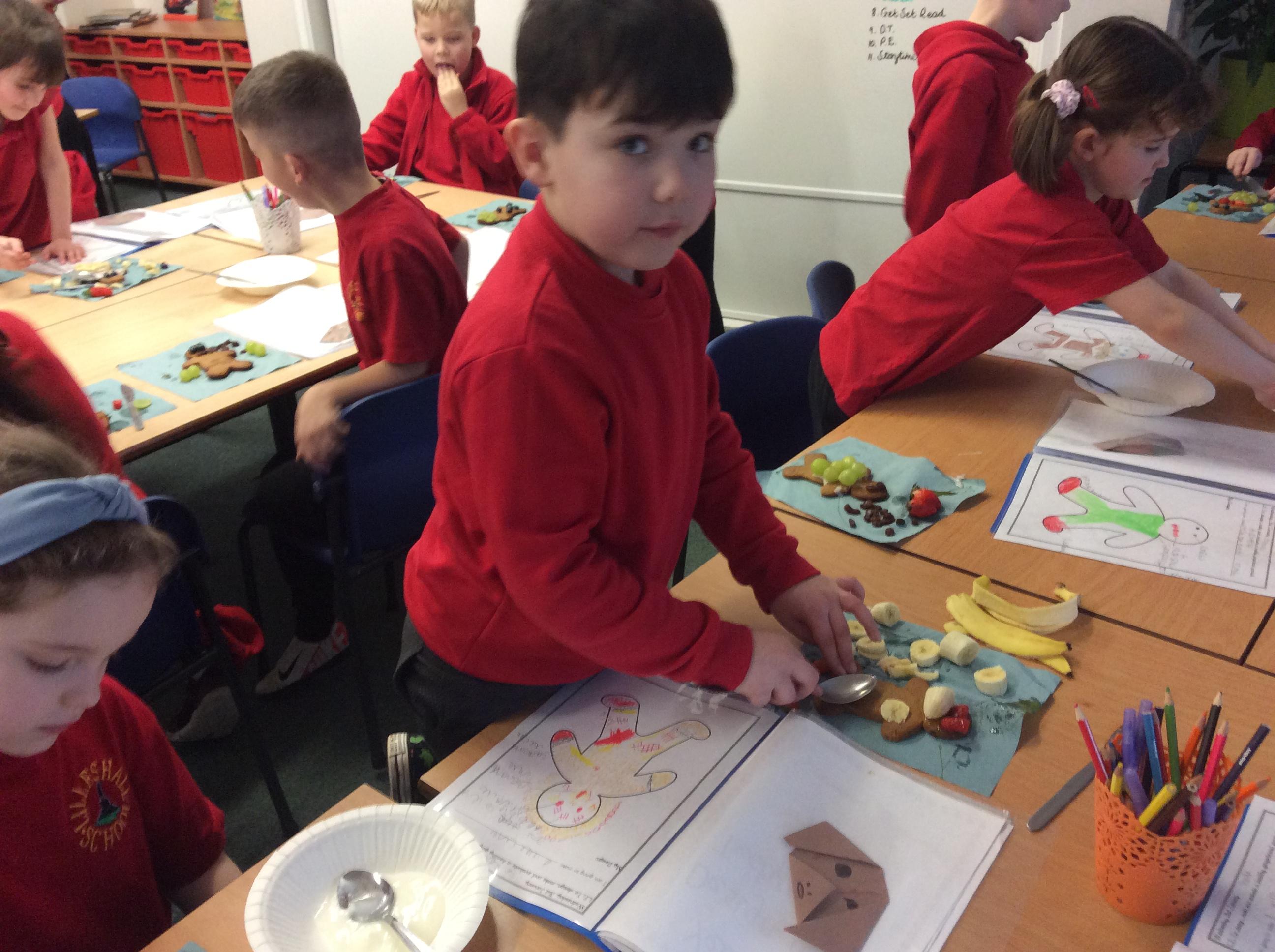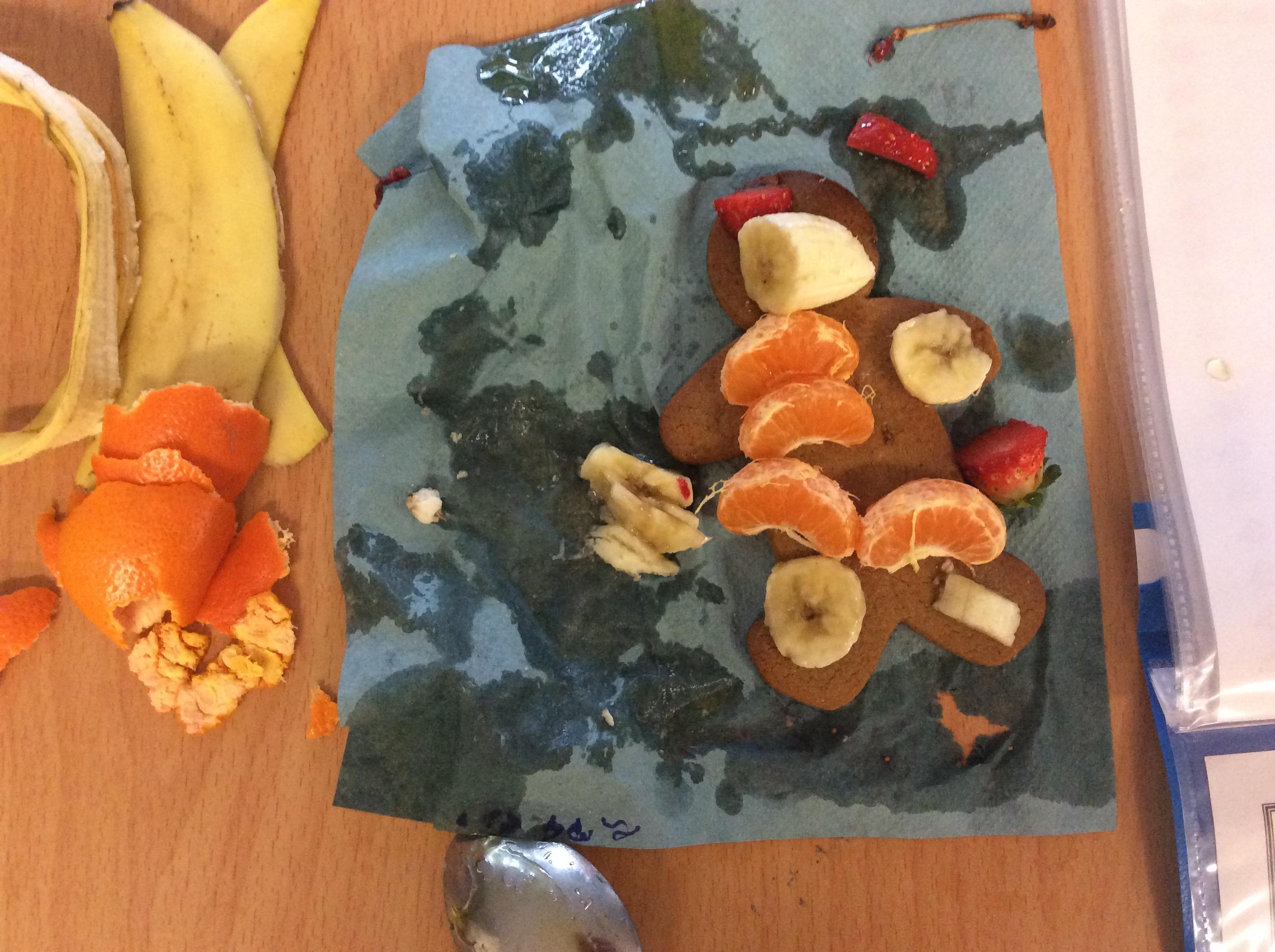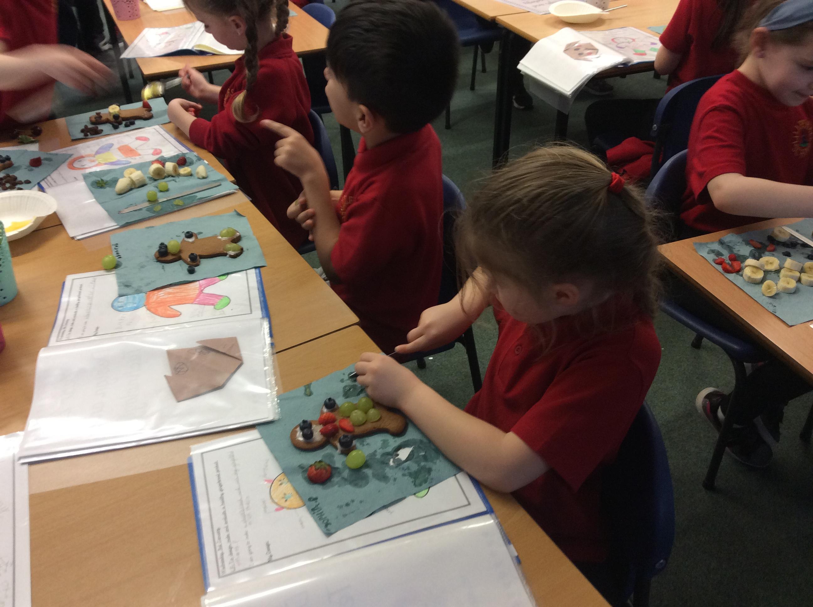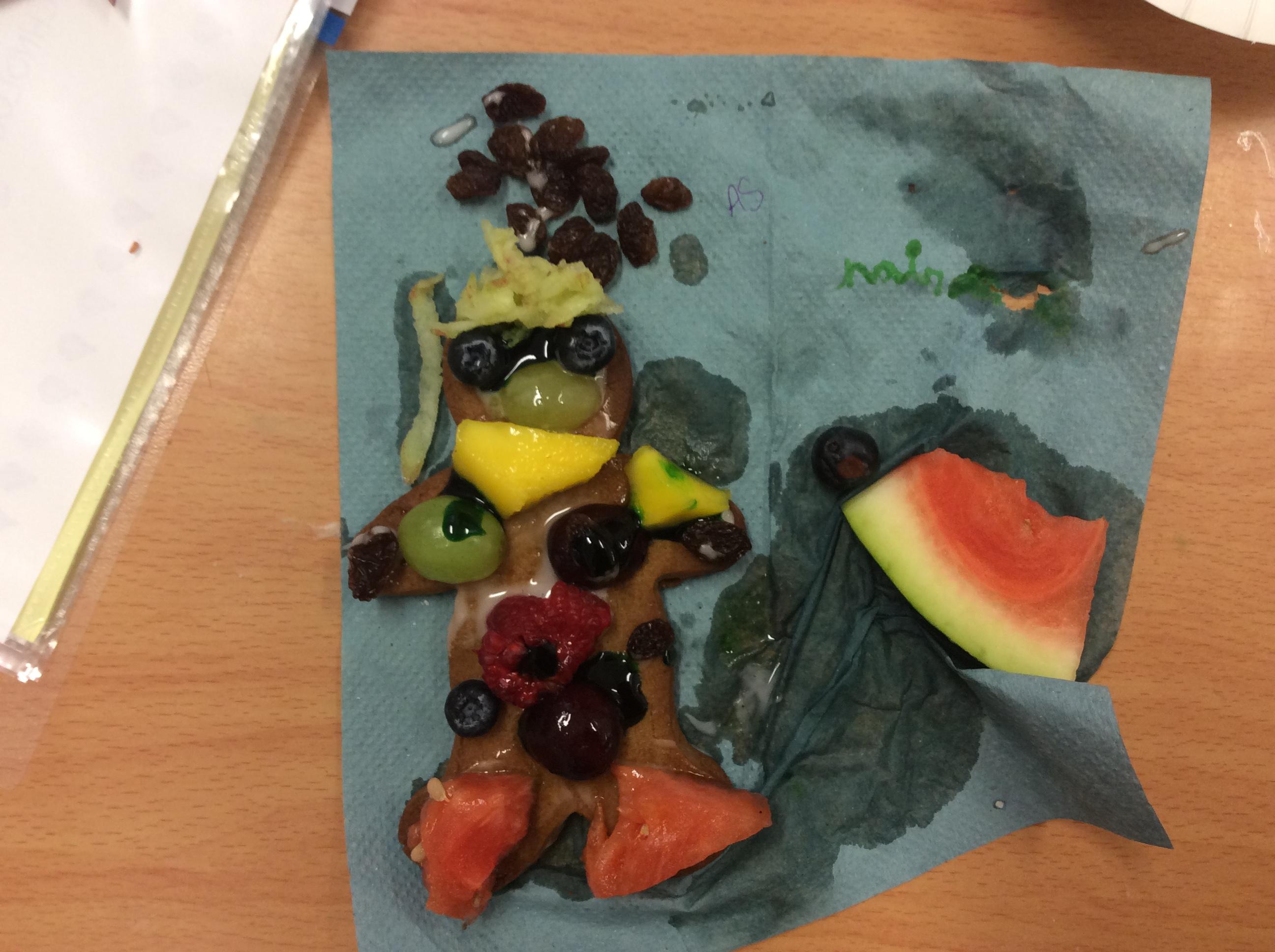 In our lesson today we made Gingerbread Men and then decorated them with healthy ingredients. We followed our designs carefully, making any adjustments needed as necessary. At the end of our lesson Mrs Cousins and Mr Firmstone-Hill came in to judge our Gingerbread Men and select two they would choose to buy based on their appearance, how healthy they were and how close to they were to the design.