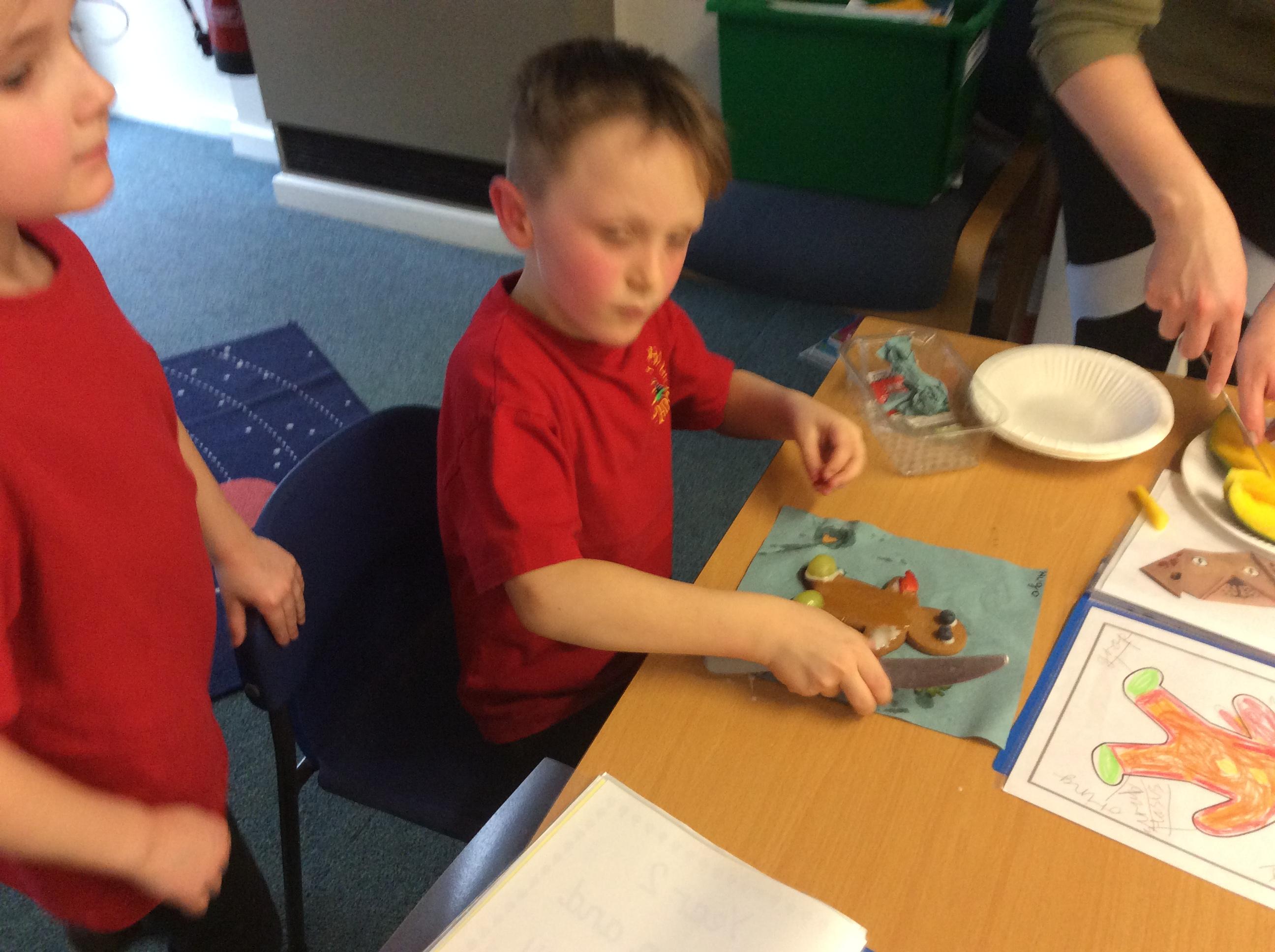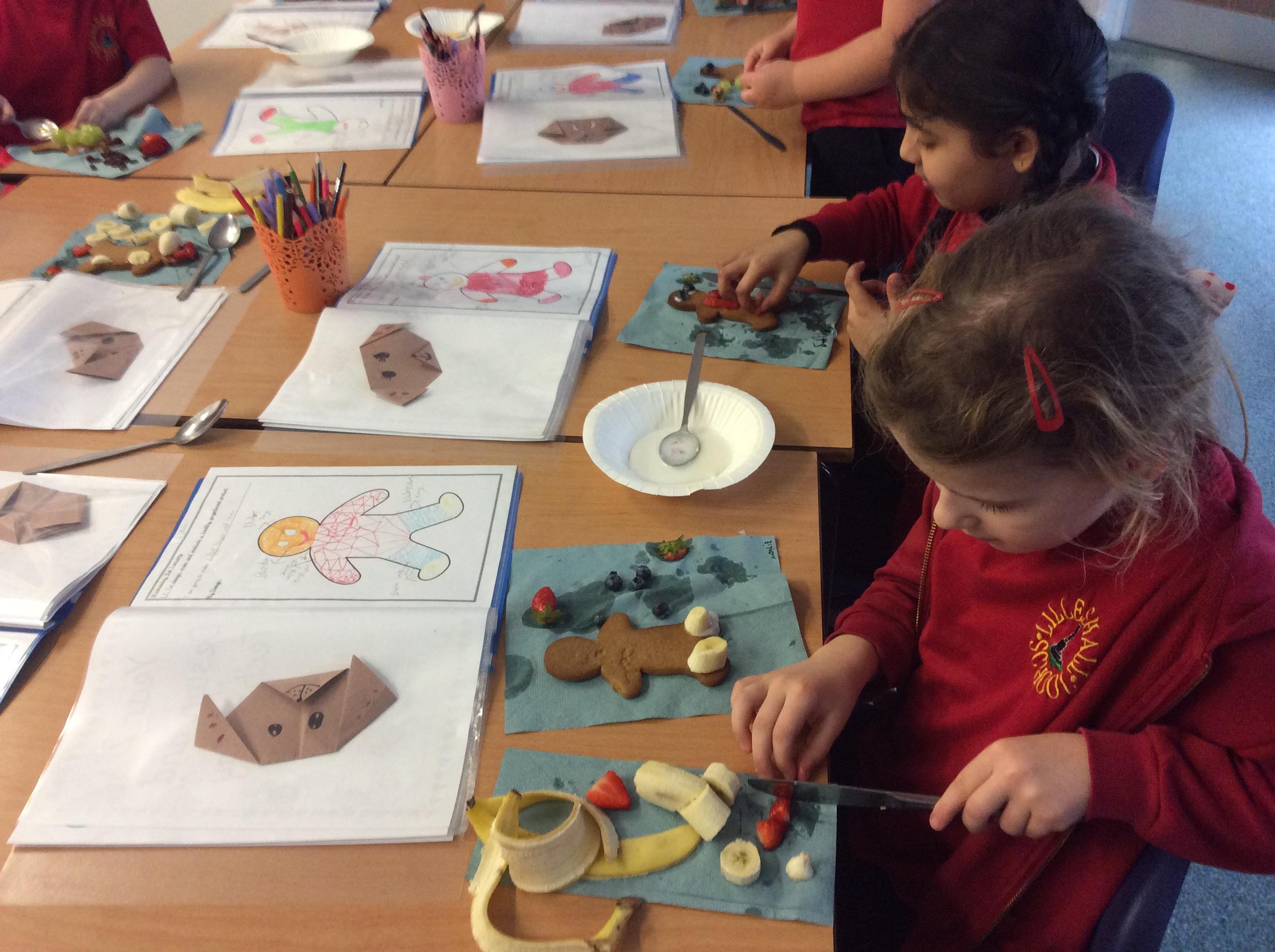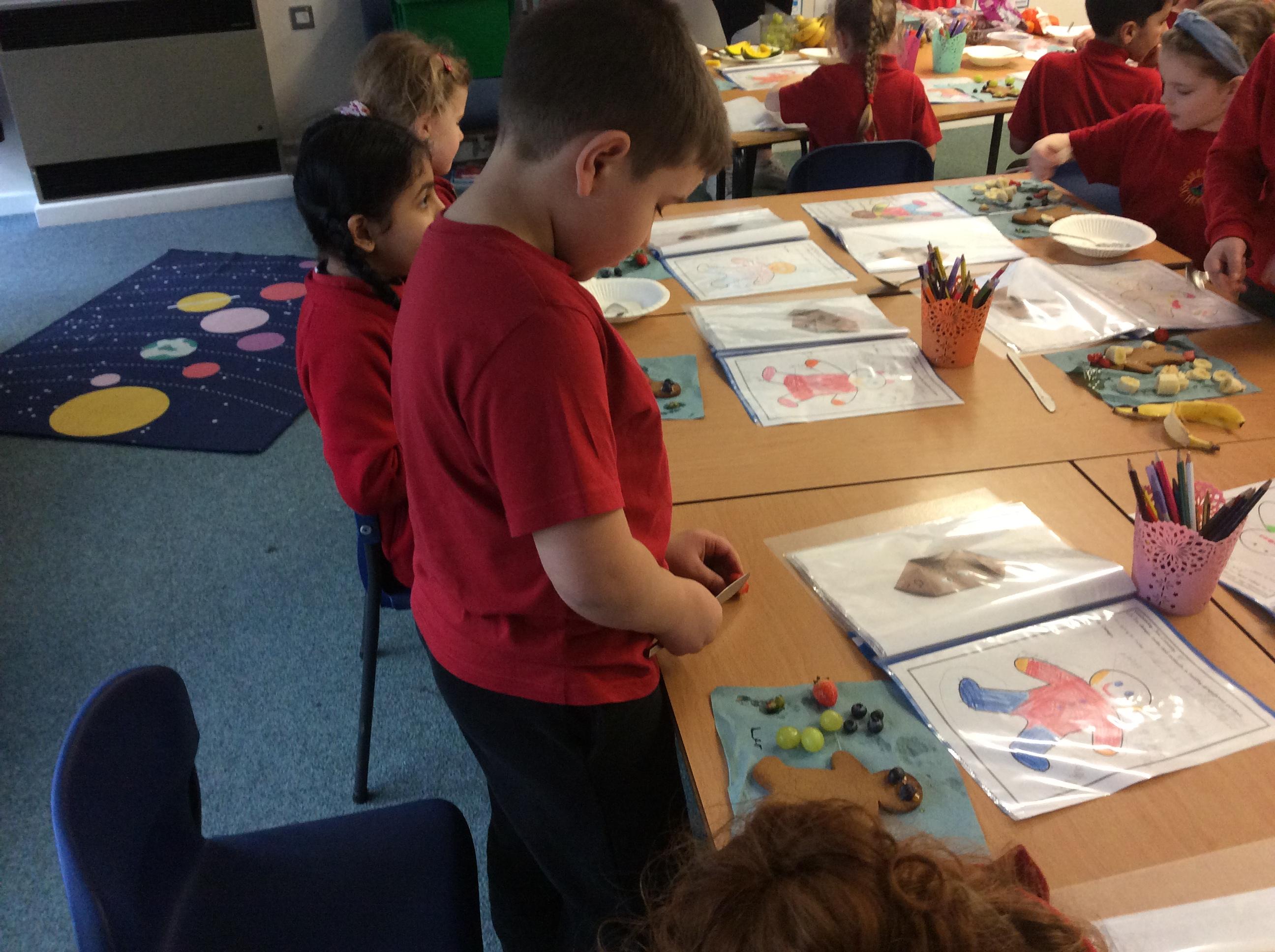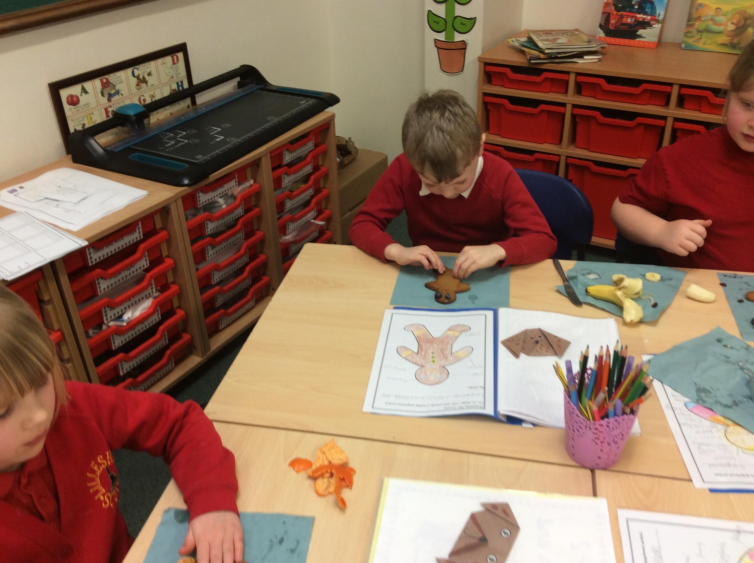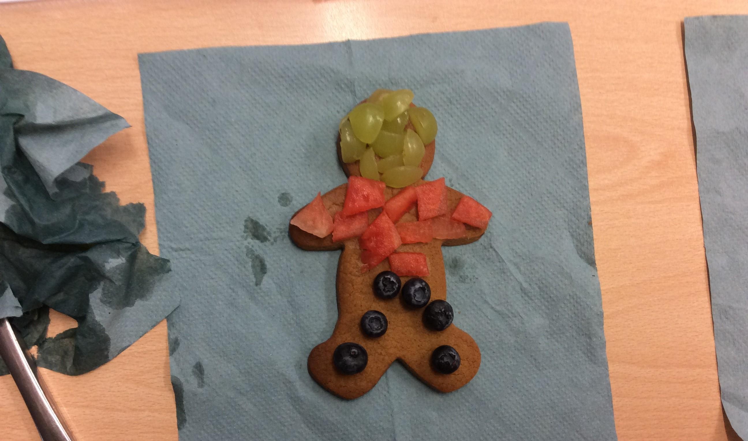 In our lesson today we made Gingerbread Men and then decorated them with healthy ingredients. We followed our designs carefully, making any adjustments needed as necessary. At the end of our lesson Mrs Cousins and Mr Firmstone-Hill came in to judge our Gingerbread Men and select two they would choose to buy based on their appearance, how healthy they were and how close to they were to the design.
