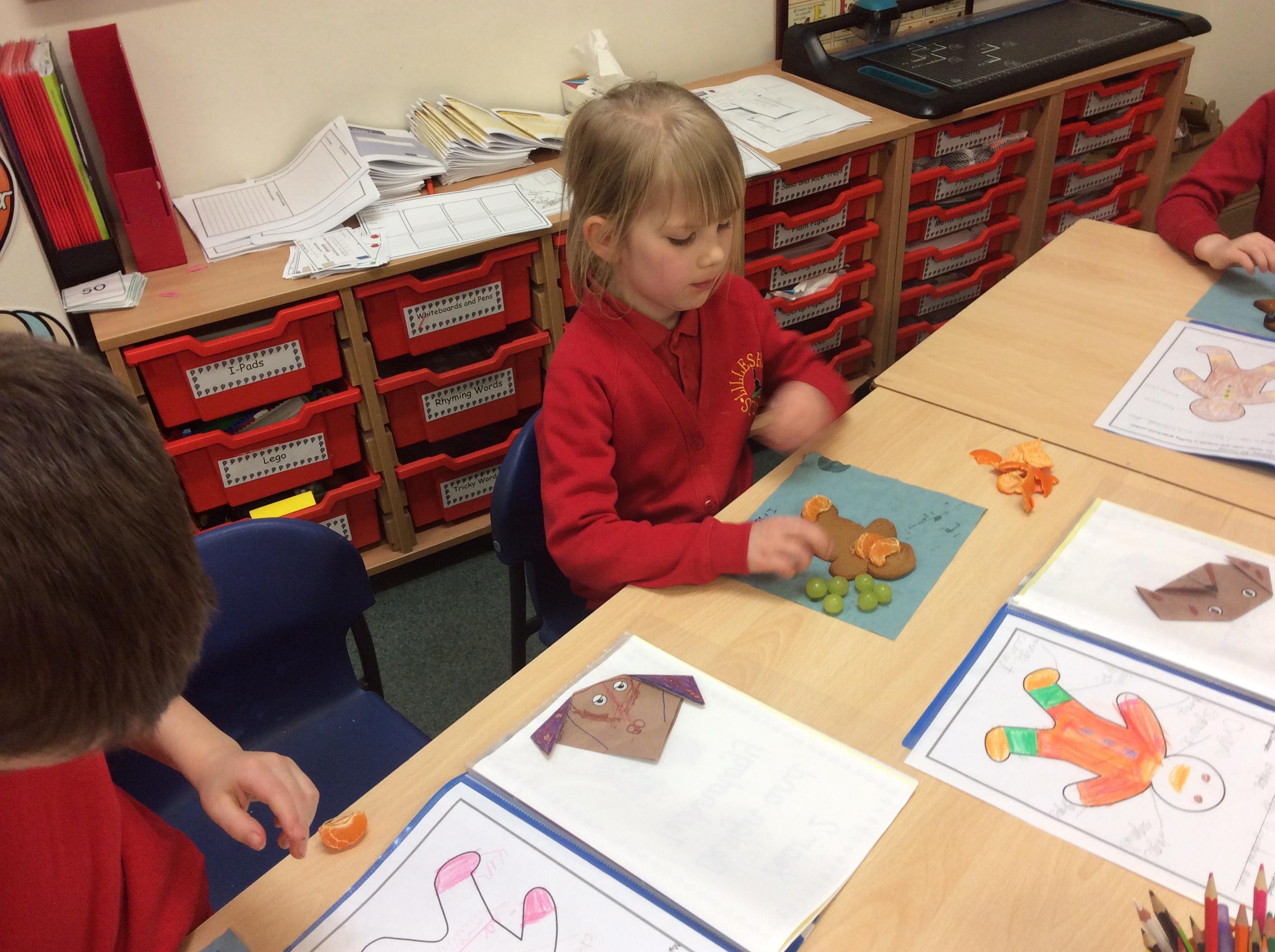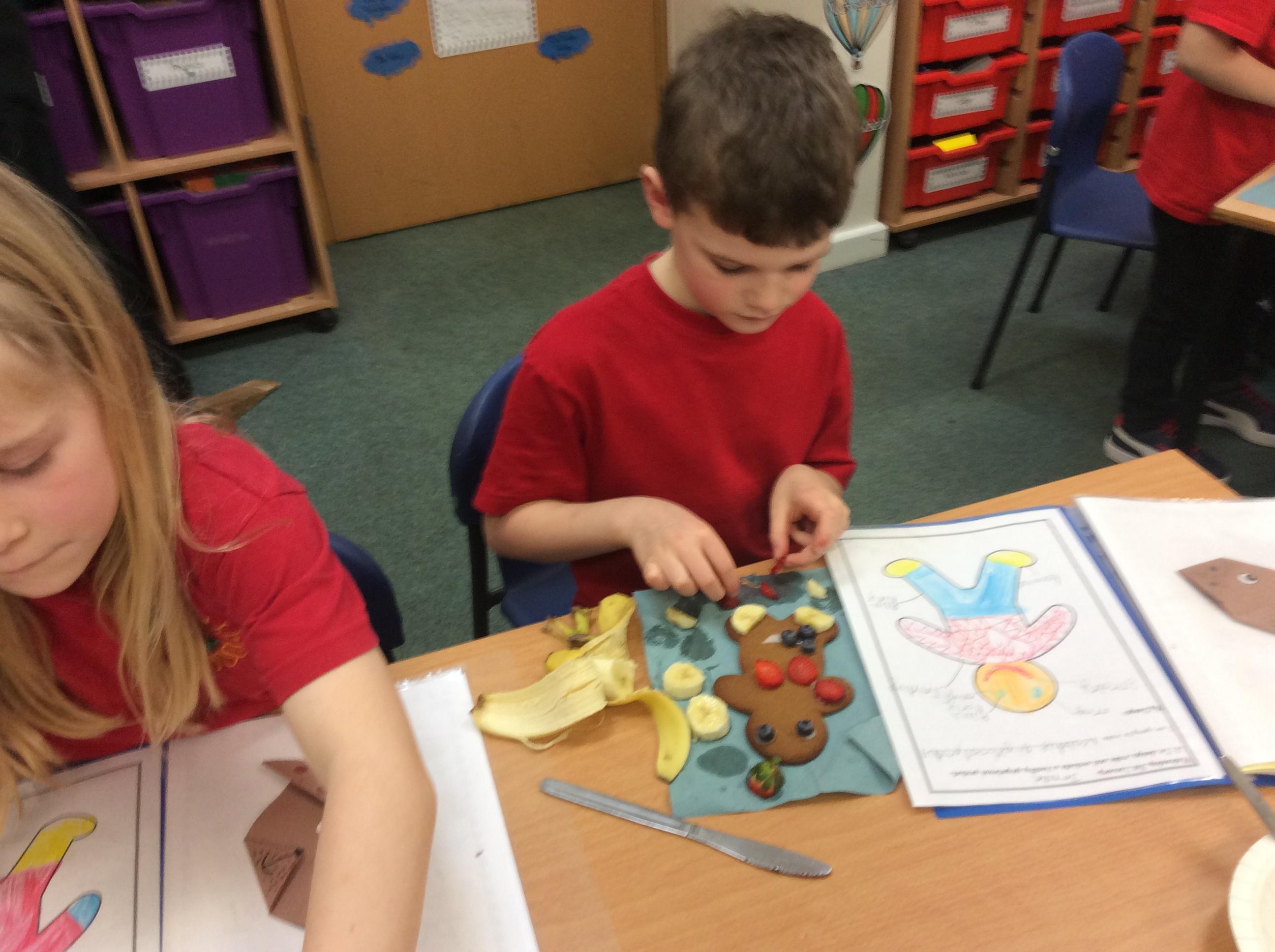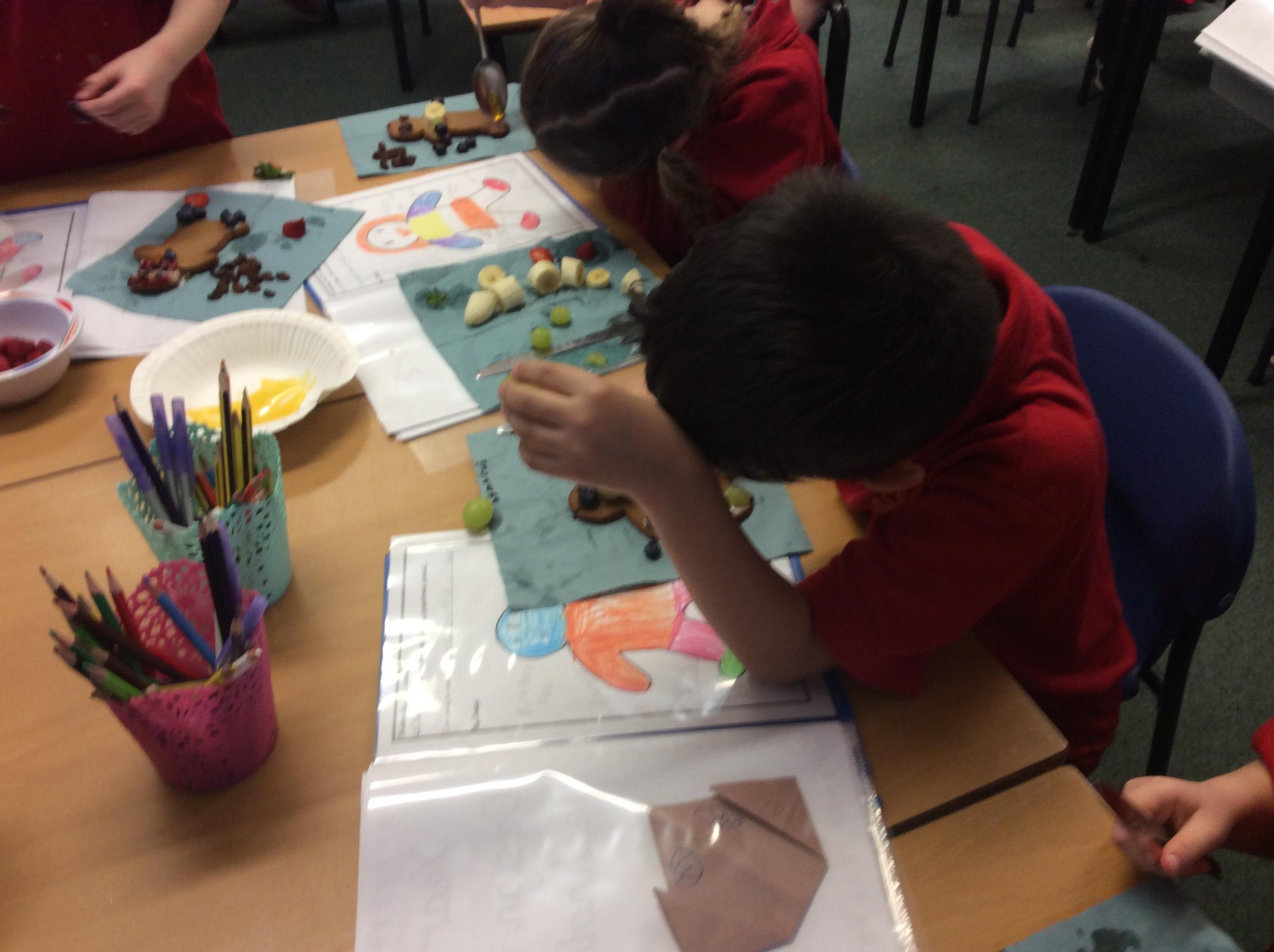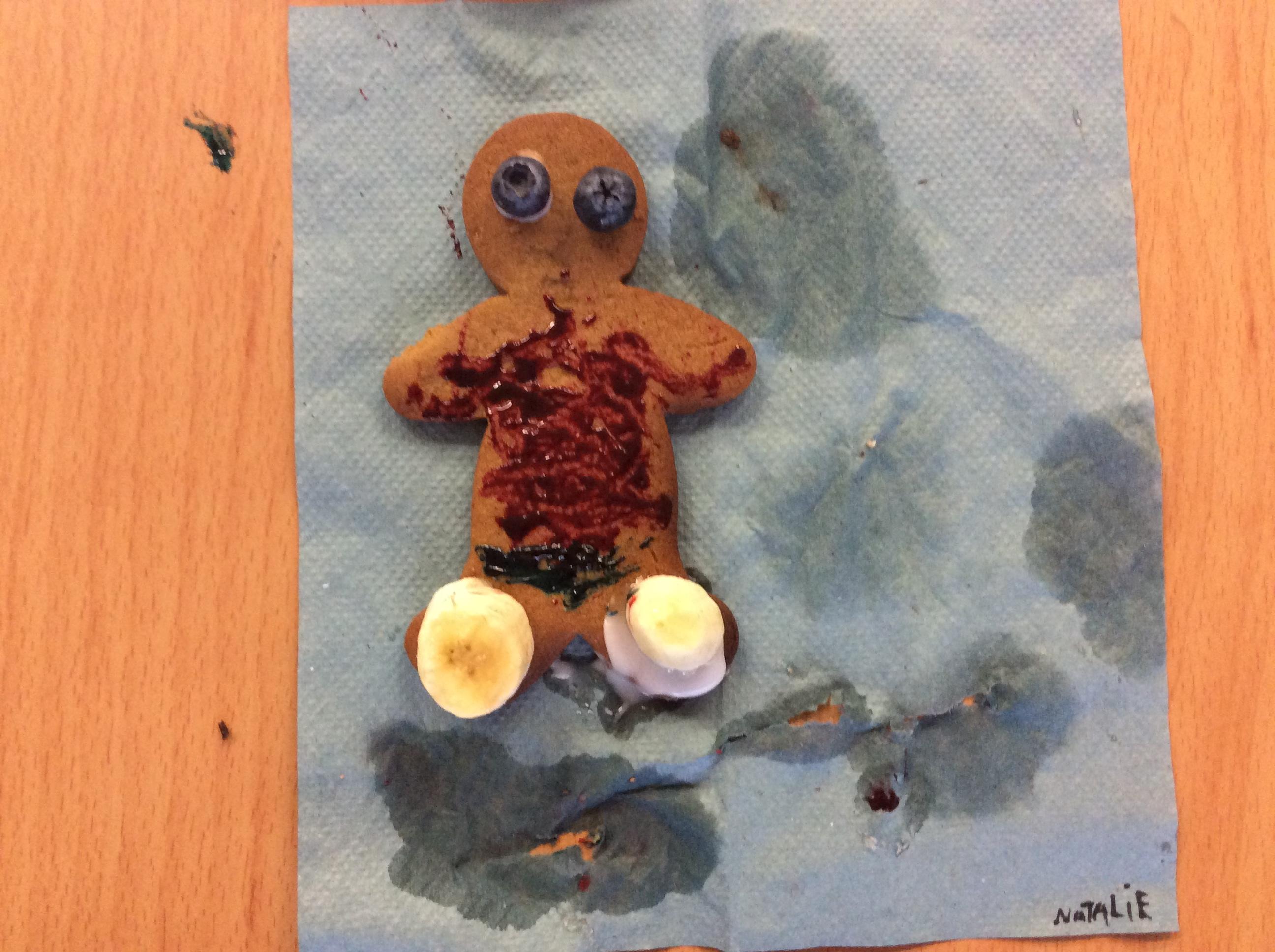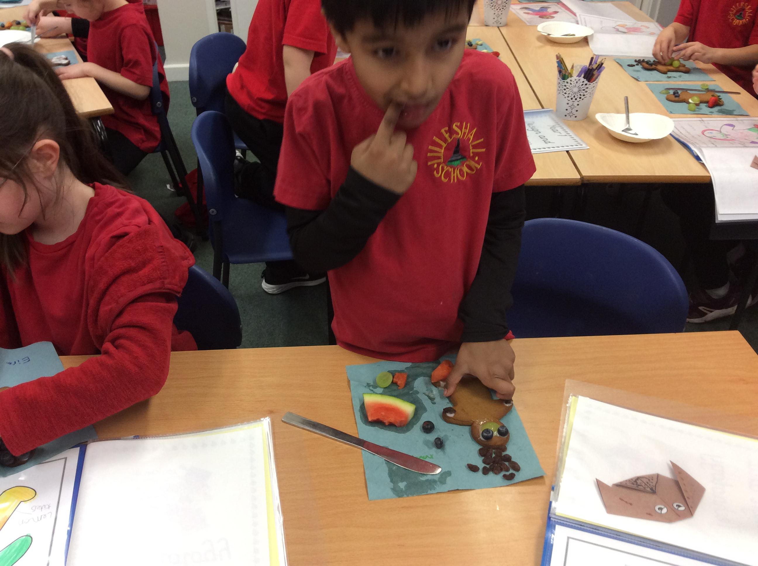 In our lesson today we made Gingerbread Men and then decorated them with healthy ingredients. We followed our designs carefully, making any adjustments needed as necessary. At the end of our lesson Mrs Cousins and Mr Firmstone-Hill came in to judge our Gingerbread Men and select two they would choose to buy based on their appearance, how healthy they were and how close to they were to the design.