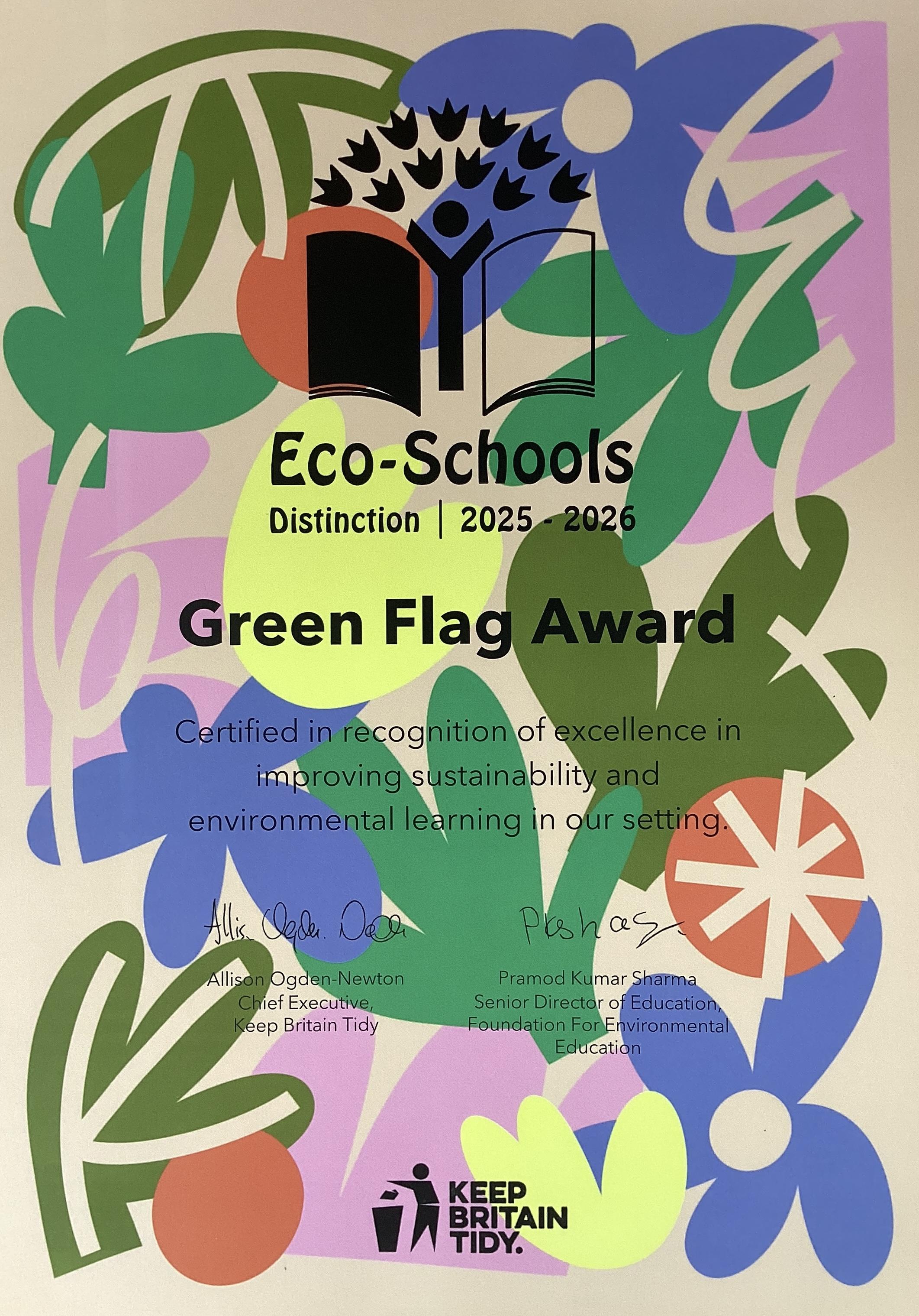Hello - we are the Eco-Committee and our job is to help the planet by spreading awareness of environmental issues and doing our best to lead change. During this year, we have worked towards renewing The Green Flag Award, which we successfully achieved in 2023 and achieved the distinction award in 2024. We started by completing an Environmental Review of the different areas involved: Biodiversity, Marine, Energy, Litter, Water, Healthy Living, School Grounds, Global Citizenship, Transport and Waste. You can see our Environmental Review on this web page. We are very proud to announce that we have once again achieved the Green Flag Award with distinction for 2025!