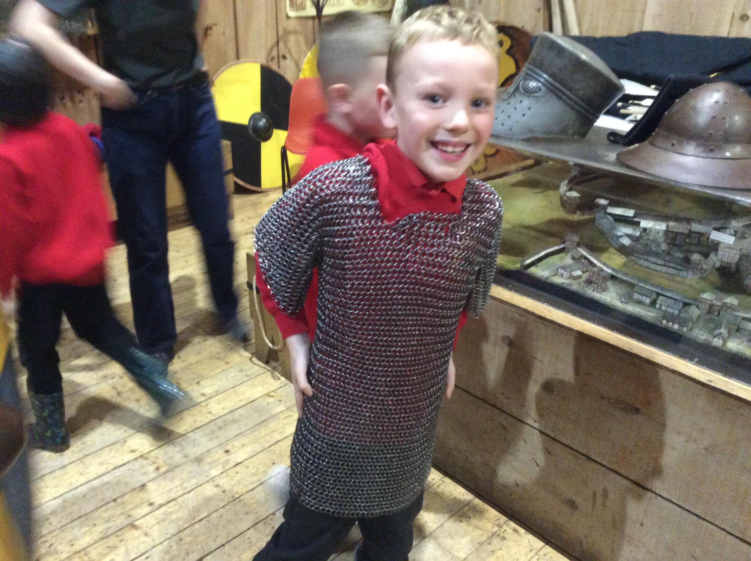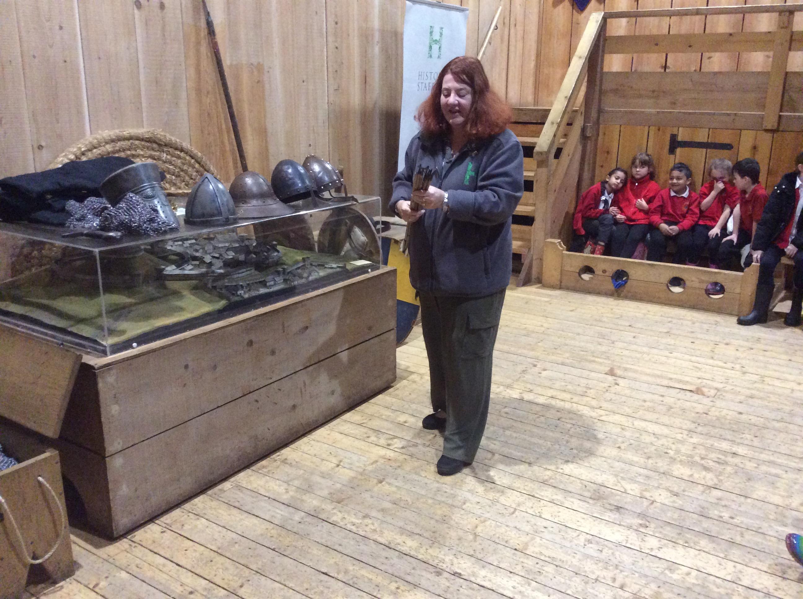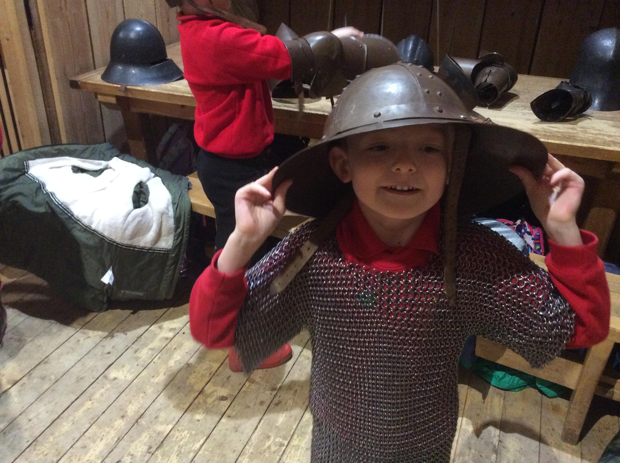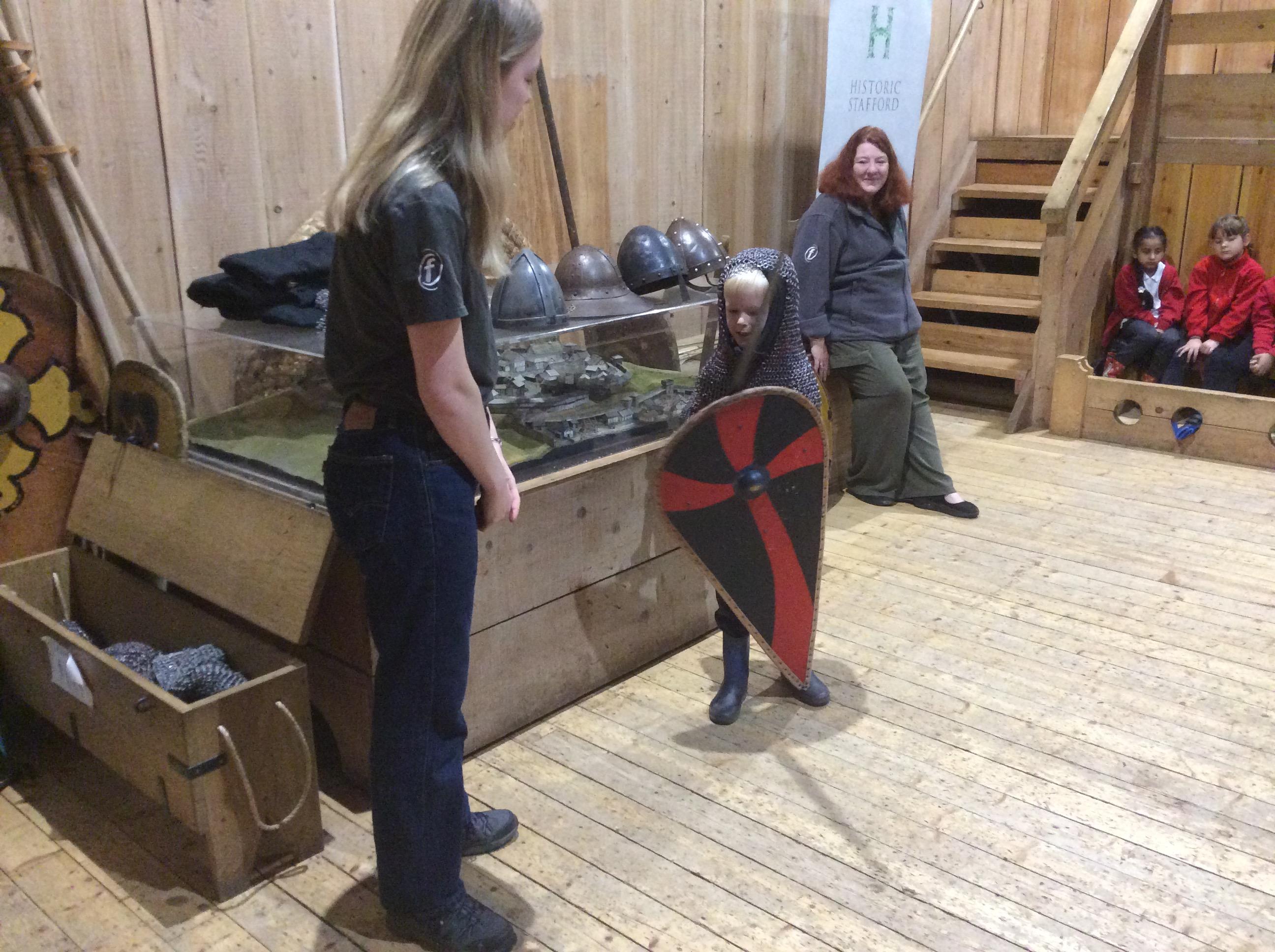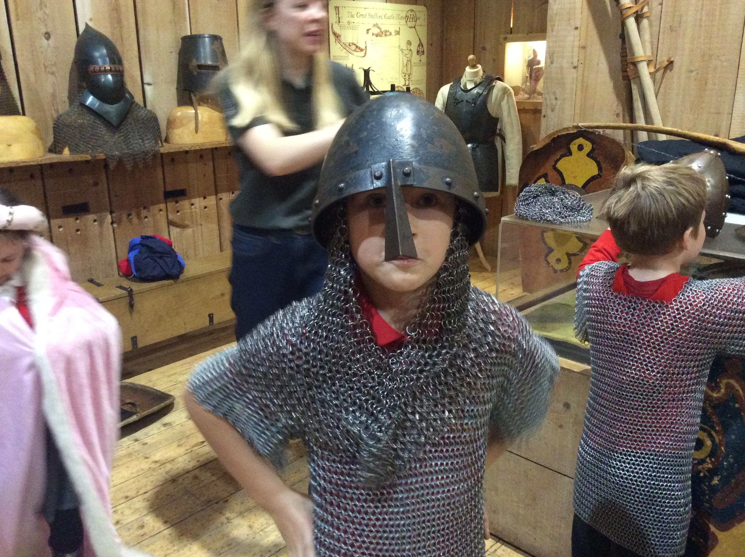 We all had the most enjoyable day visiting Stafford Castle. We had the opportunity to walk round the castle grounds through the outer bailey, the inner bailey and we then charged up the motte to the keep, imagining we were attacking the castle in Norman times. As well as trying on chain mail, armour, helmets and other outfits we were able to hold and observe weapons and then mint a Norman coin and make lavender bags. We all agreed it had been a very interesting and exciting day, imagining we were living in Norman times.