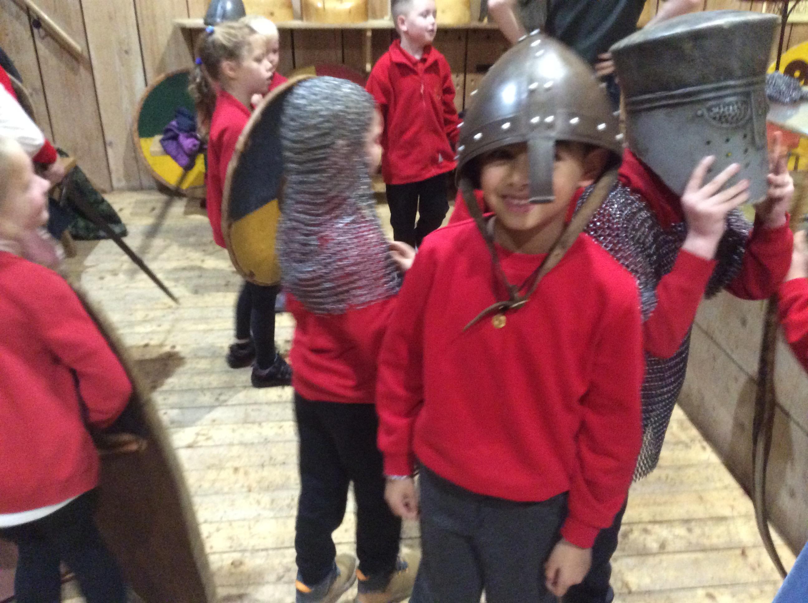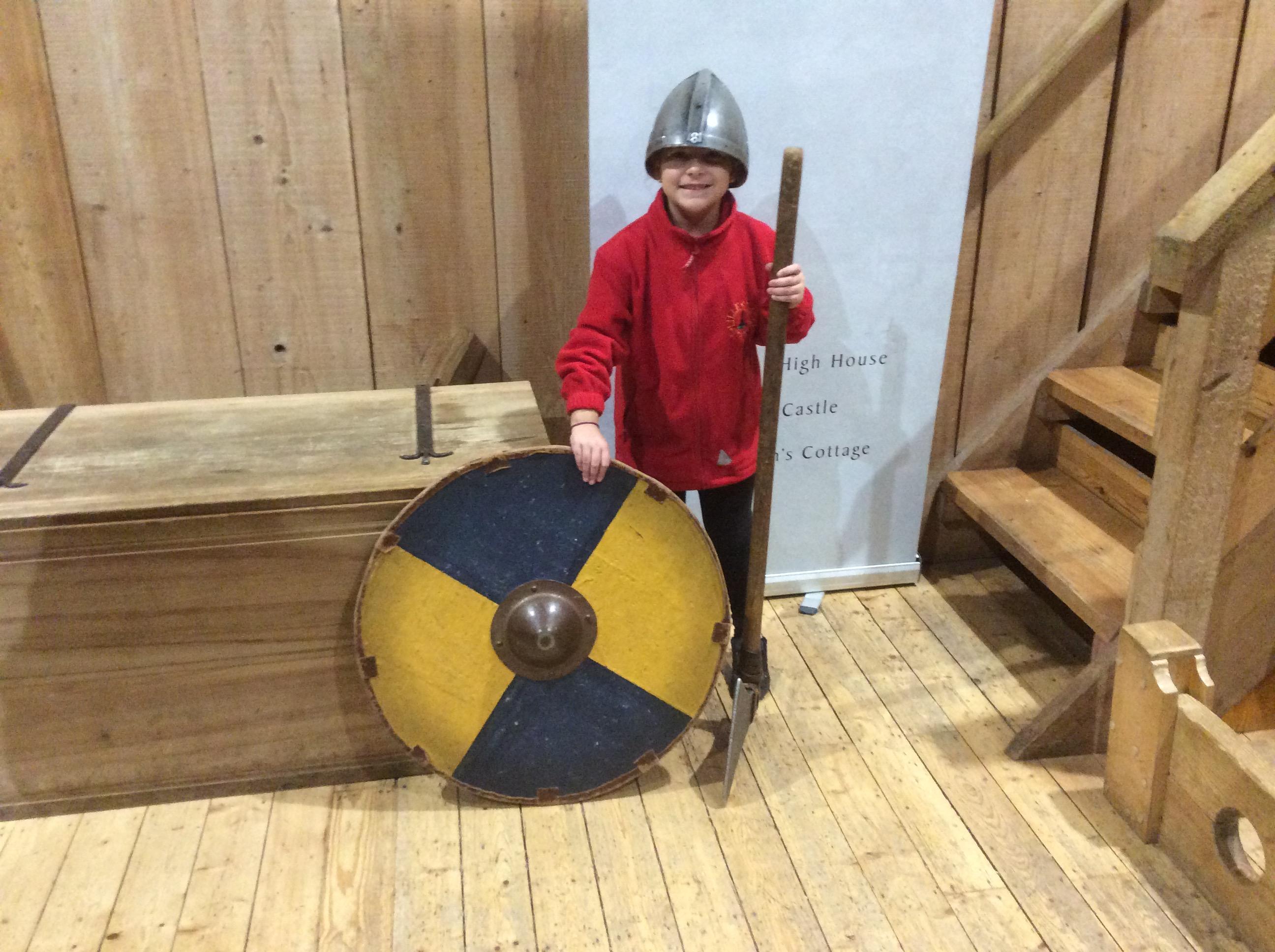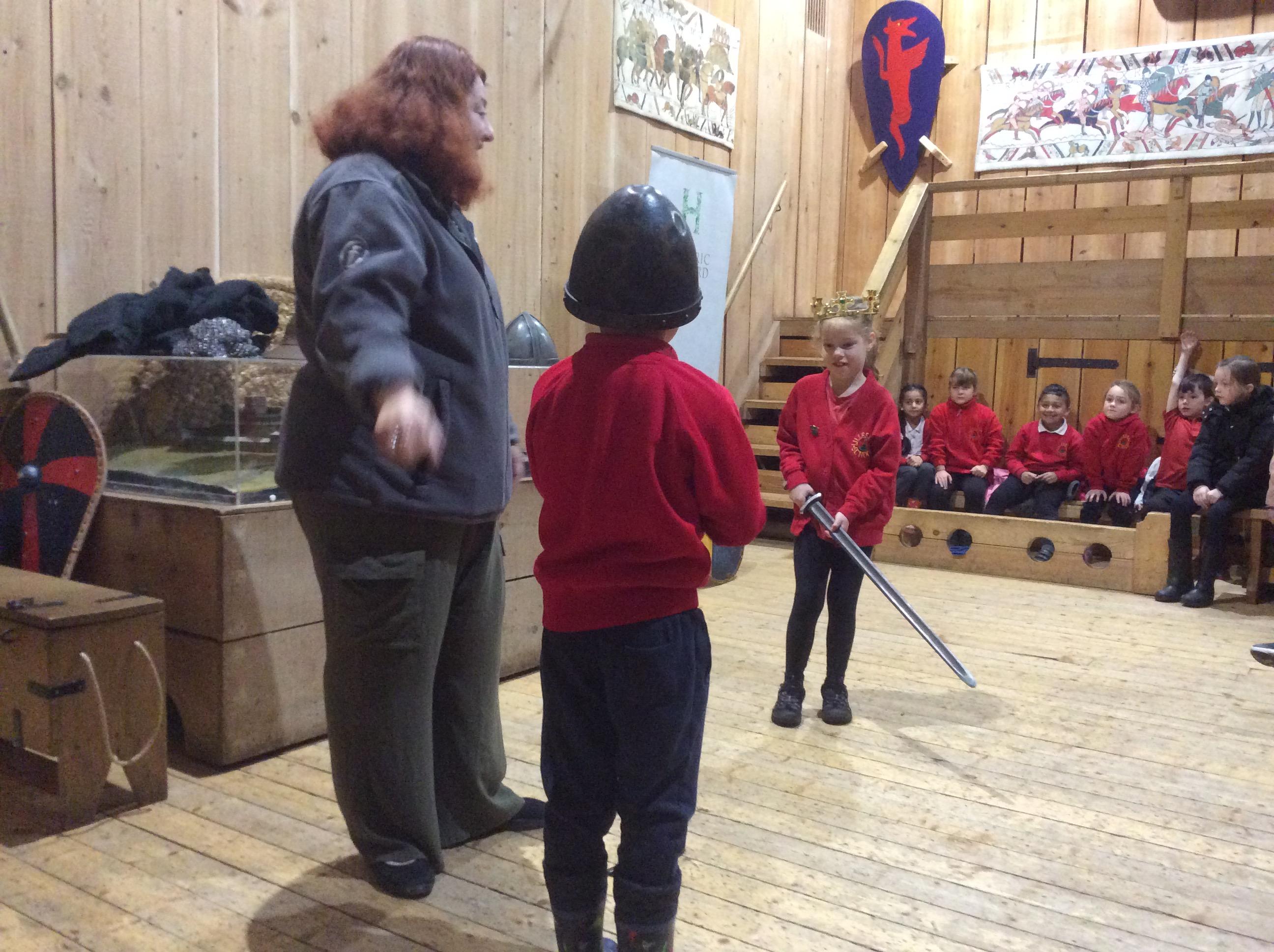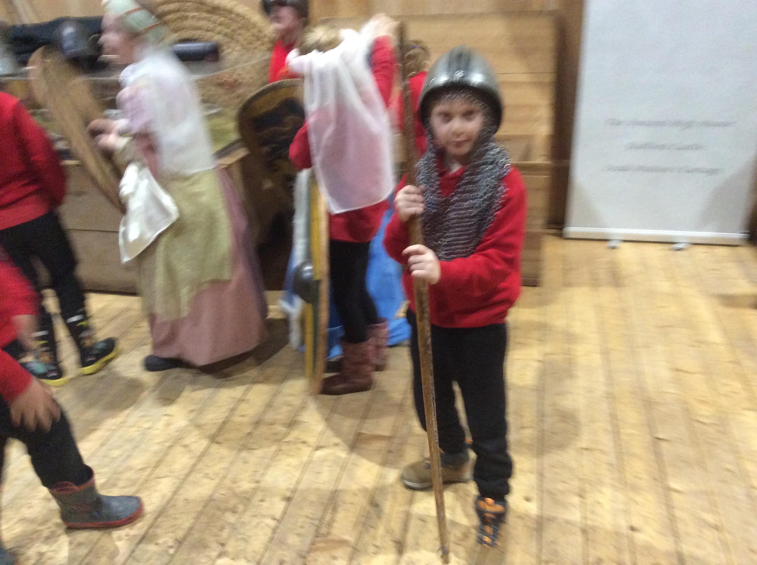 We all had the most enjoyable day visiting Stafford Castle. We had the opportunity to walk round the castle grounds through the outer bailey, the inner bailey and we then charged up the motte to the keep, imagining we were attacking the castle in Norman times. As well as trying on chain mail, armour, helmets and other outfits we were able to hold and observe weapons and then mint a Norman coin and make lavender bags. We all agreed it had been a very interesting and exciting day, imagining we were living in Norman times.