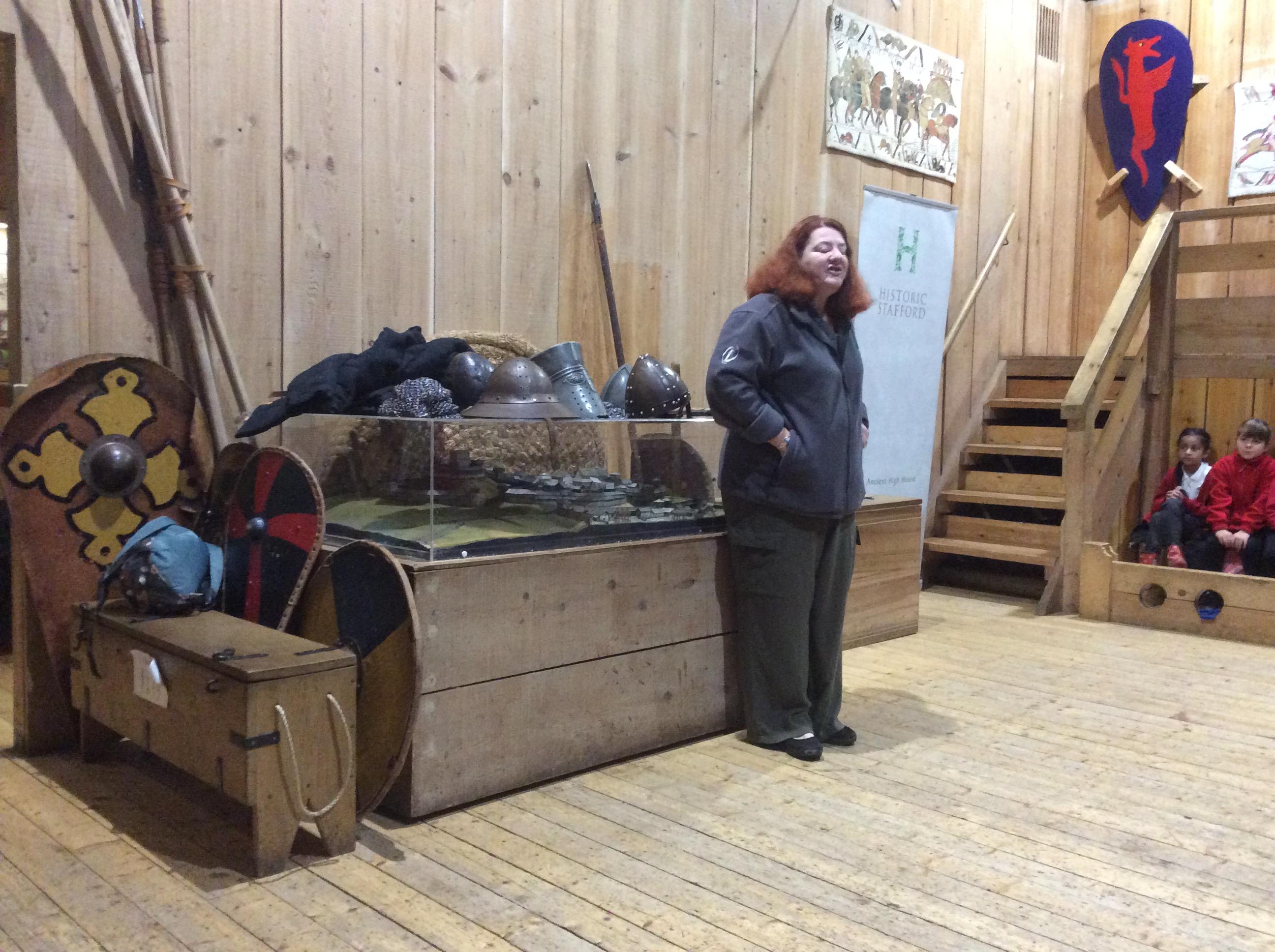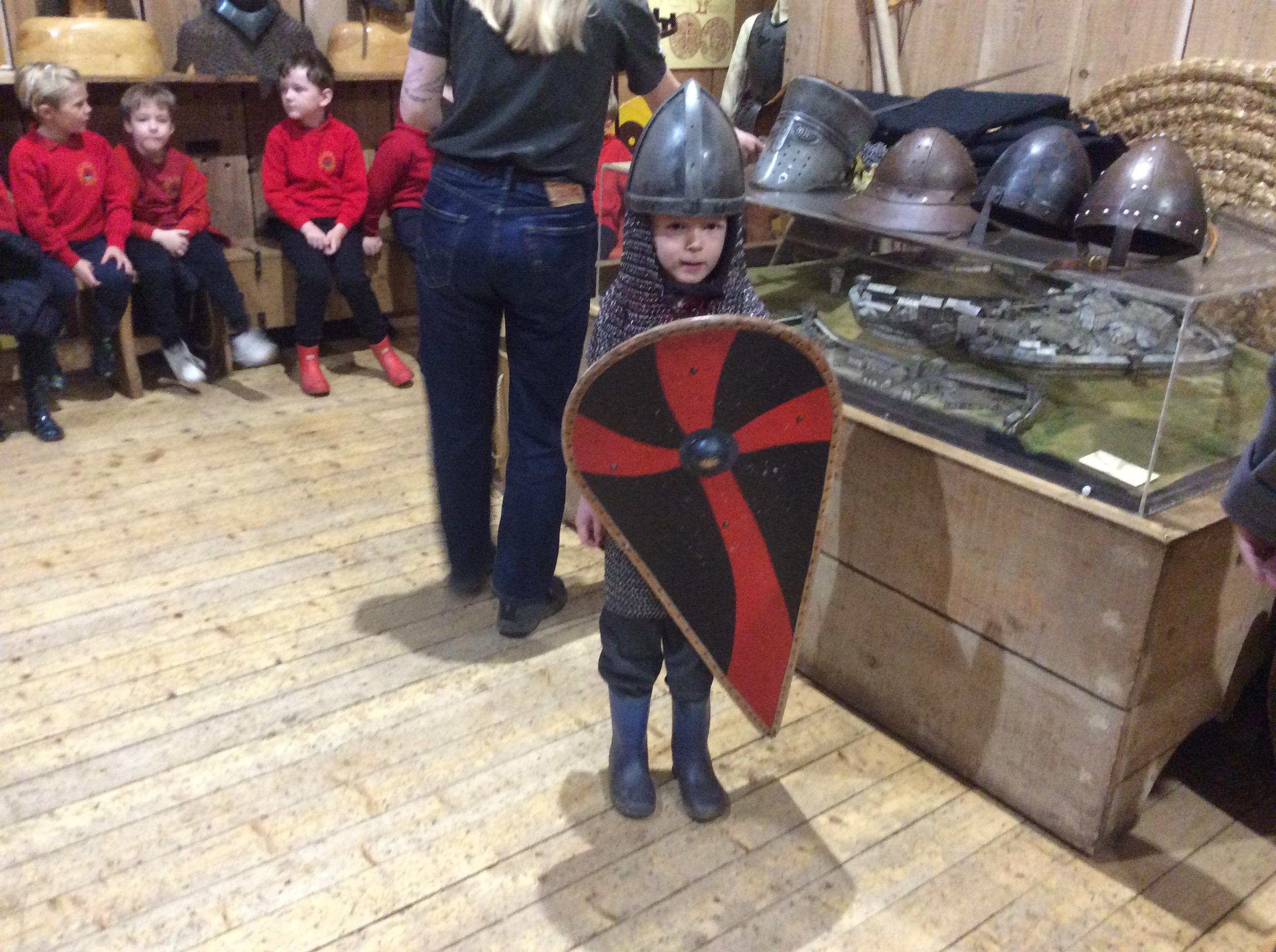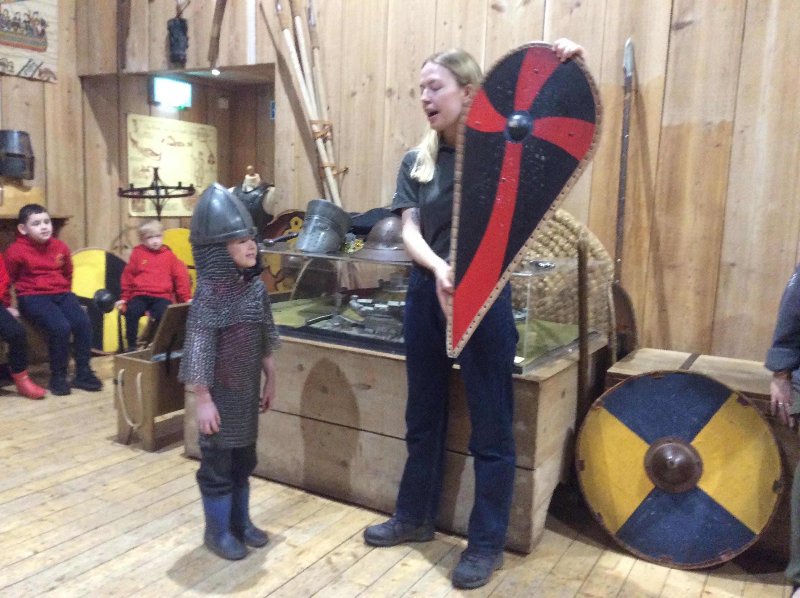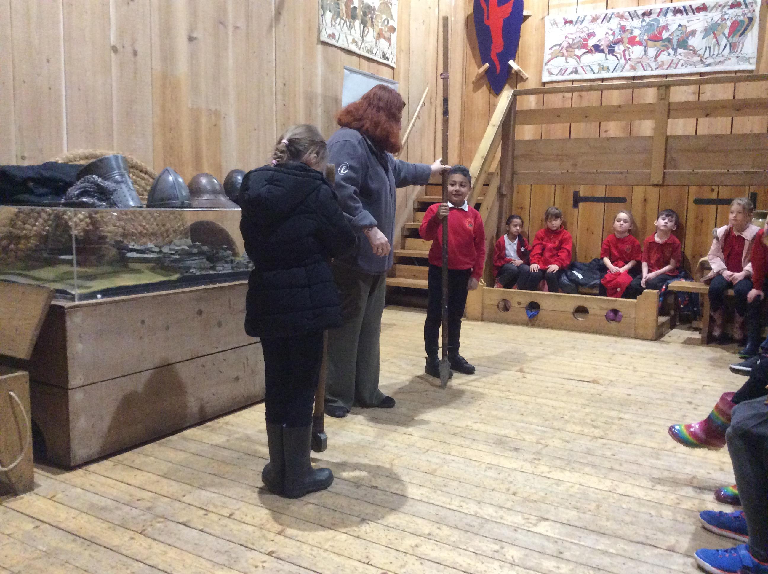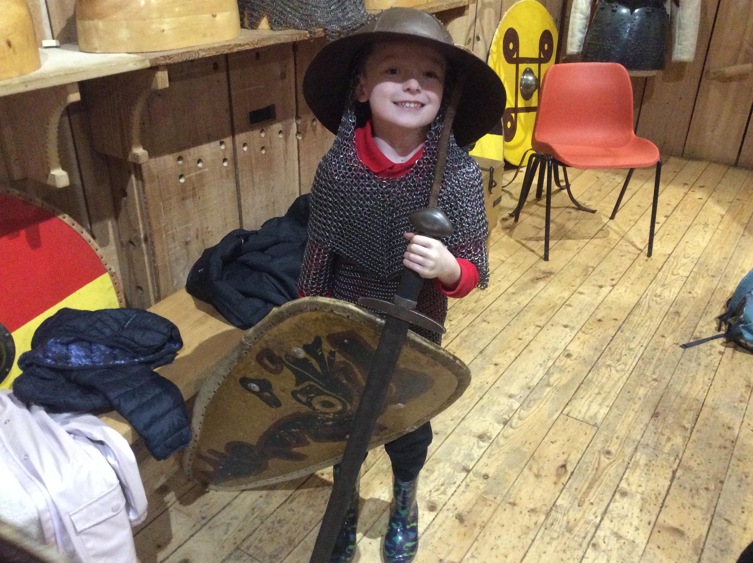 We all had the most enjoyable day visiting Stafford Castle. We had the opportunity to walk round the castle grounds through the outer bailey, the inner bailey and we then charged up the motte to the keep, imagining we were attacking the castle in Norman times. As well as trying on chain mail, armour, helmets and other outfits we were able to hold and observe weapons and then mint a Norman coin and make lavender bags. We all agreed it had been a very interesting and exciting day, imagining we were living in Norman times.