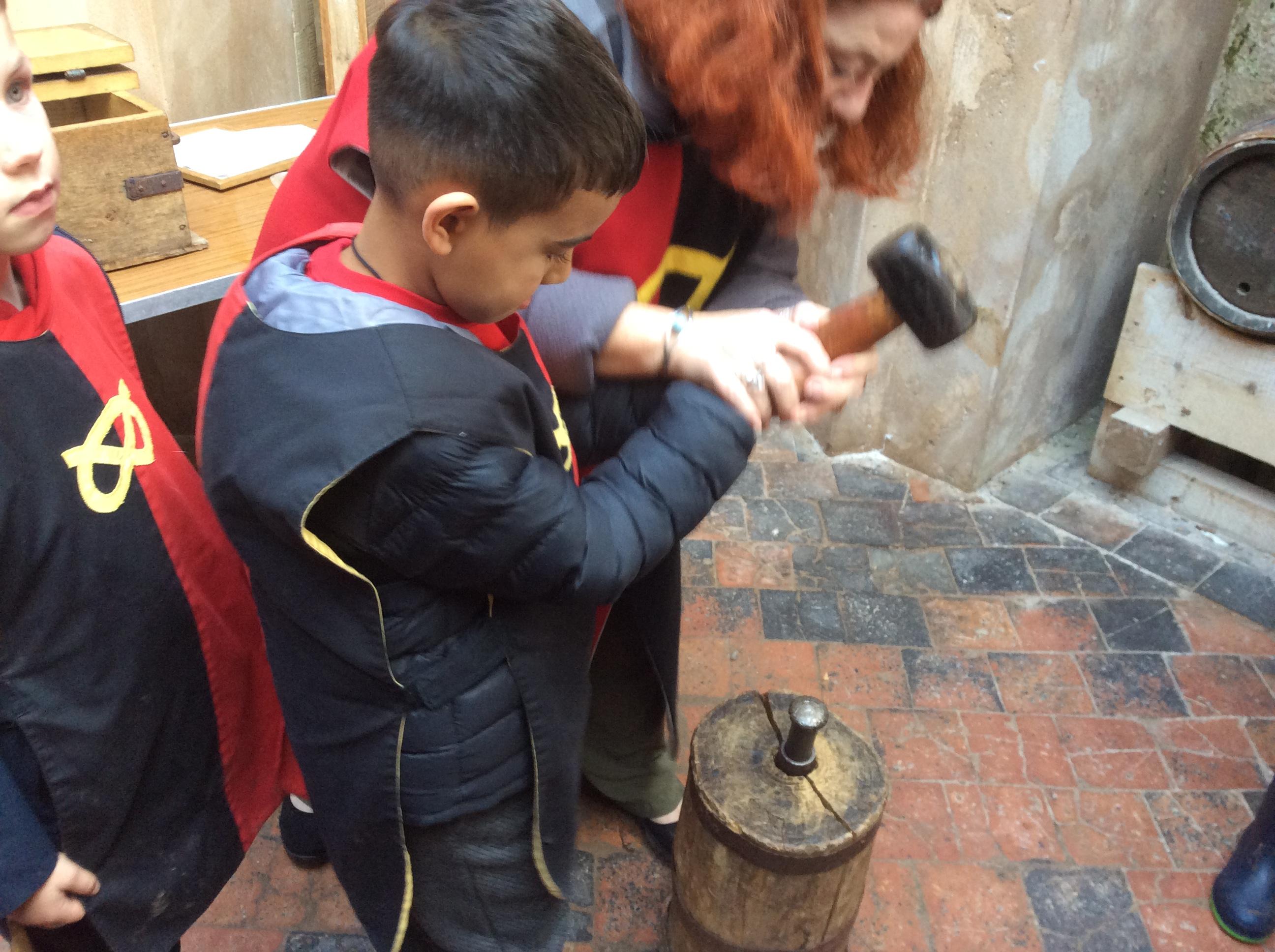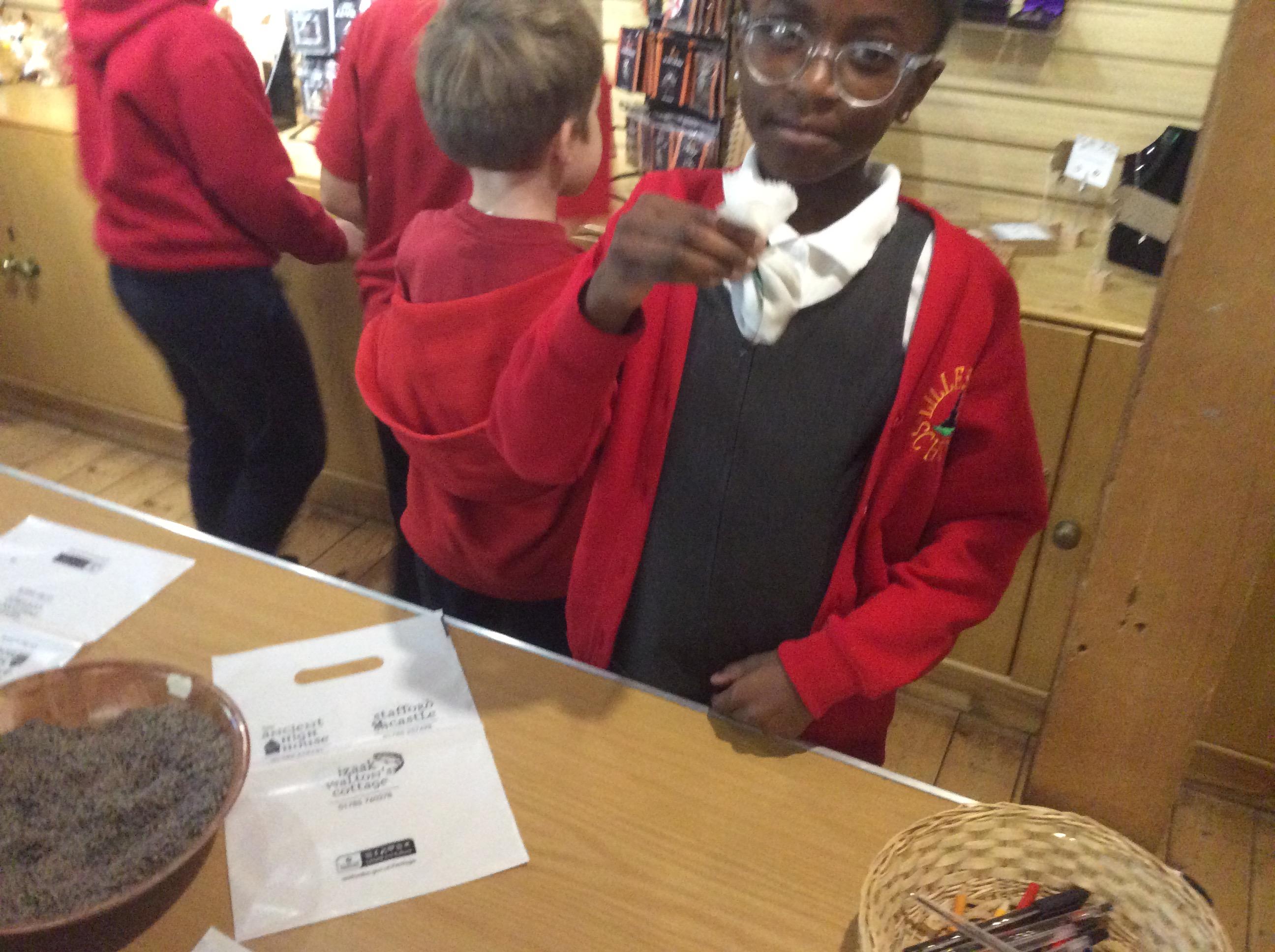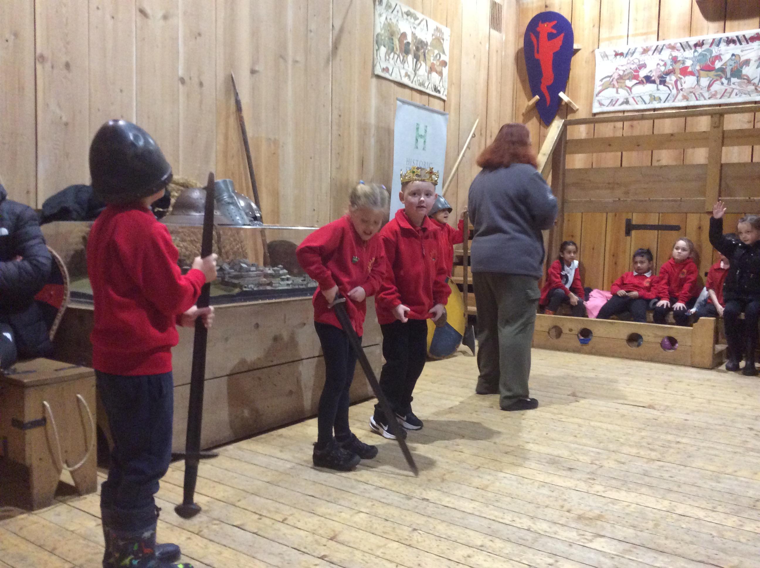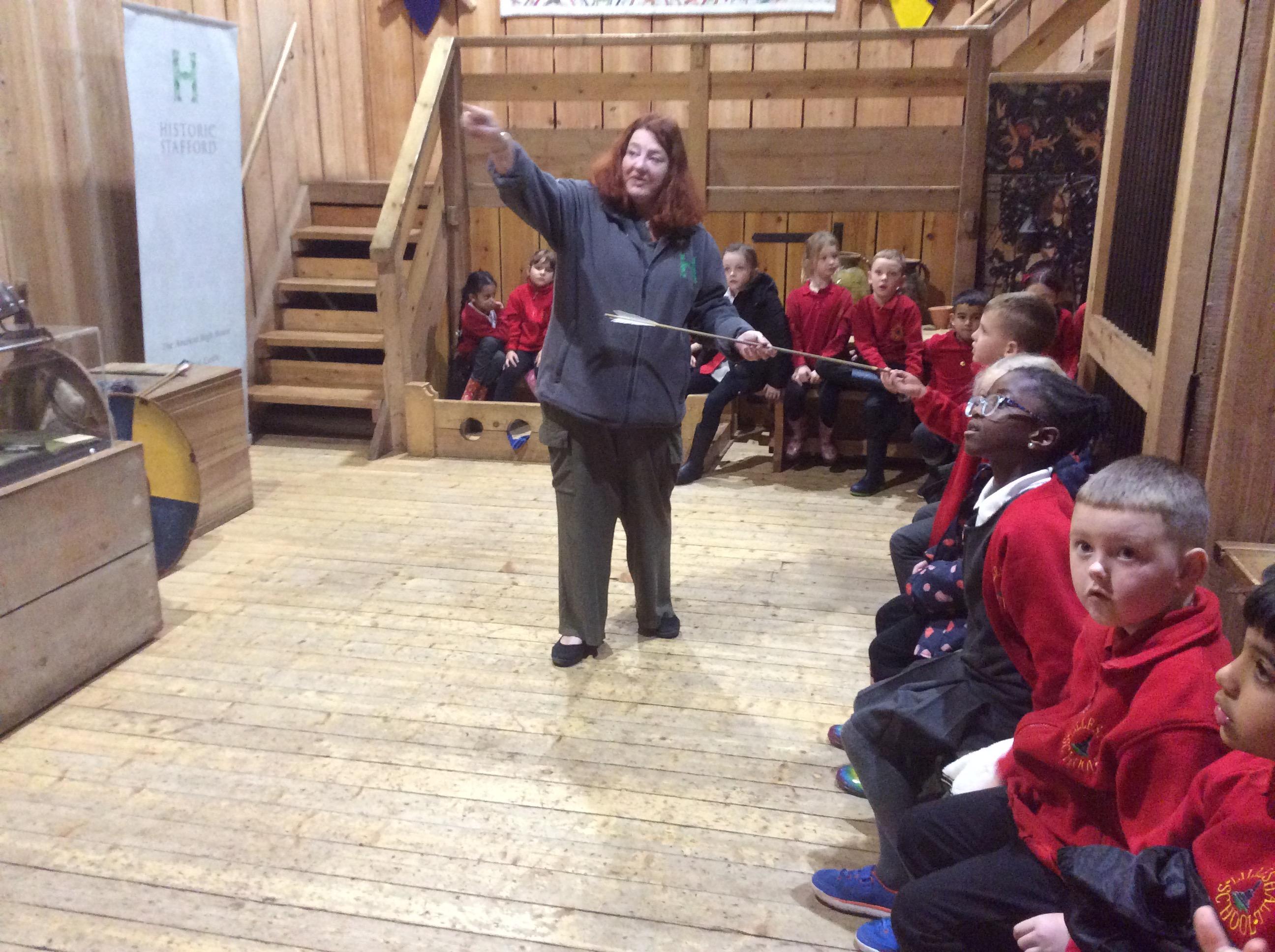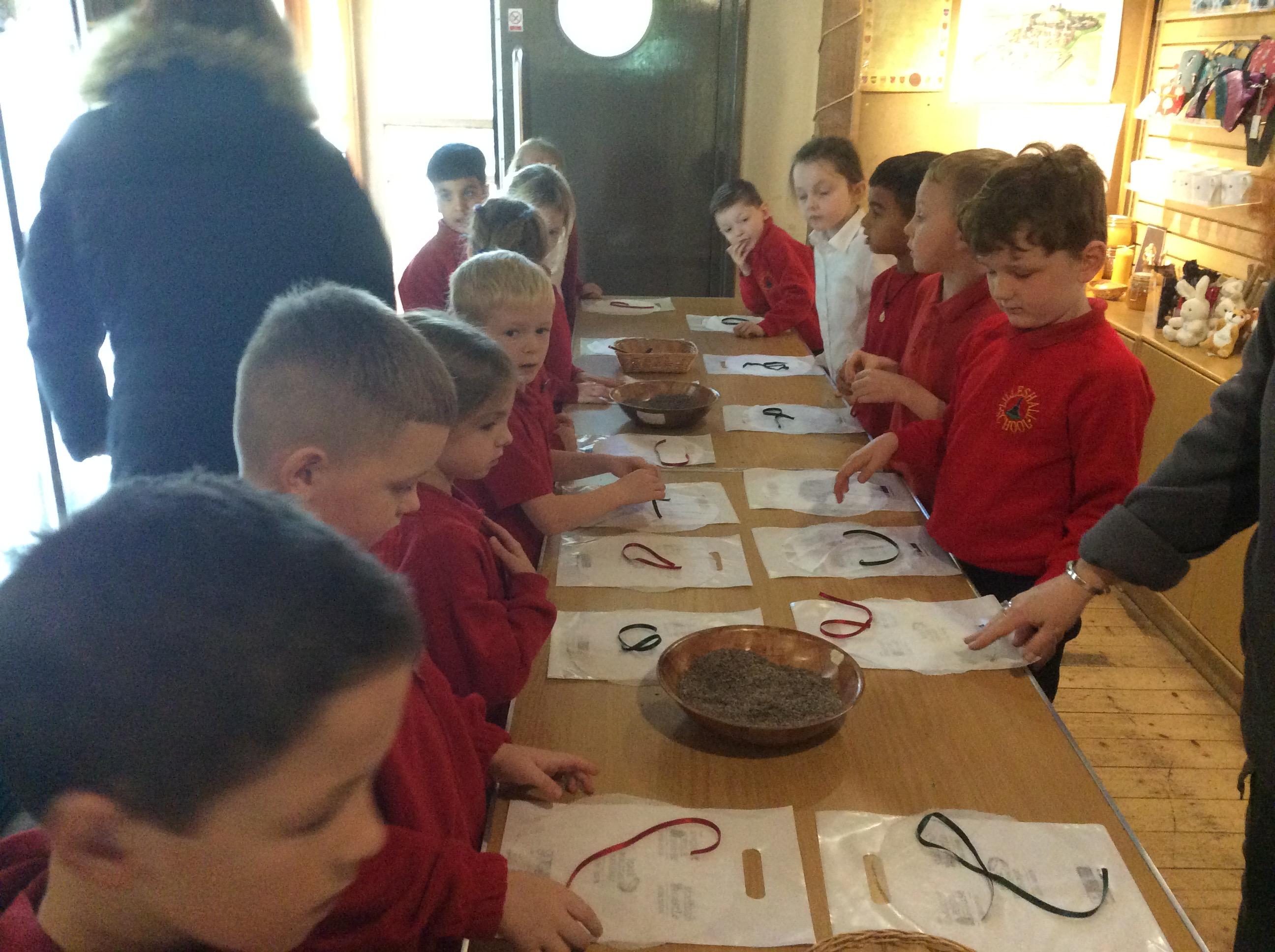 We all had the most enjoyable day visiting Stafford Castle. We had the opportunity to walk round the castle grounds through the outer bailey, the inner bailey and we then charged up the motte to the keep, imagining we were attacking the castle in Norman times. As well as trying on chain mail, armour, helmets and other outfits we were able to hold and observe weapons and then mint a Norman coin and make lavender bags. We all agreed it had been a very interesting and exciting day, imagining we were living in Norman times.